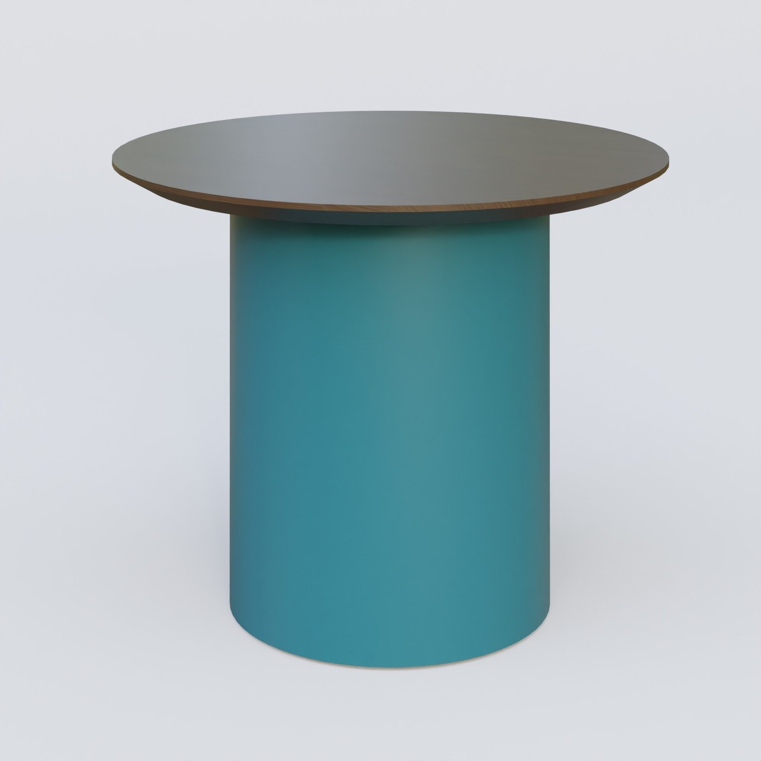 Table Basse Fashion Styl piètement colonne en métal D-26cm et plateau bois. Plateau Chêne Moka et pietement Bleu Petrole (RAL 5025).