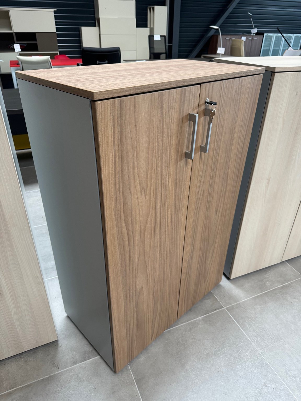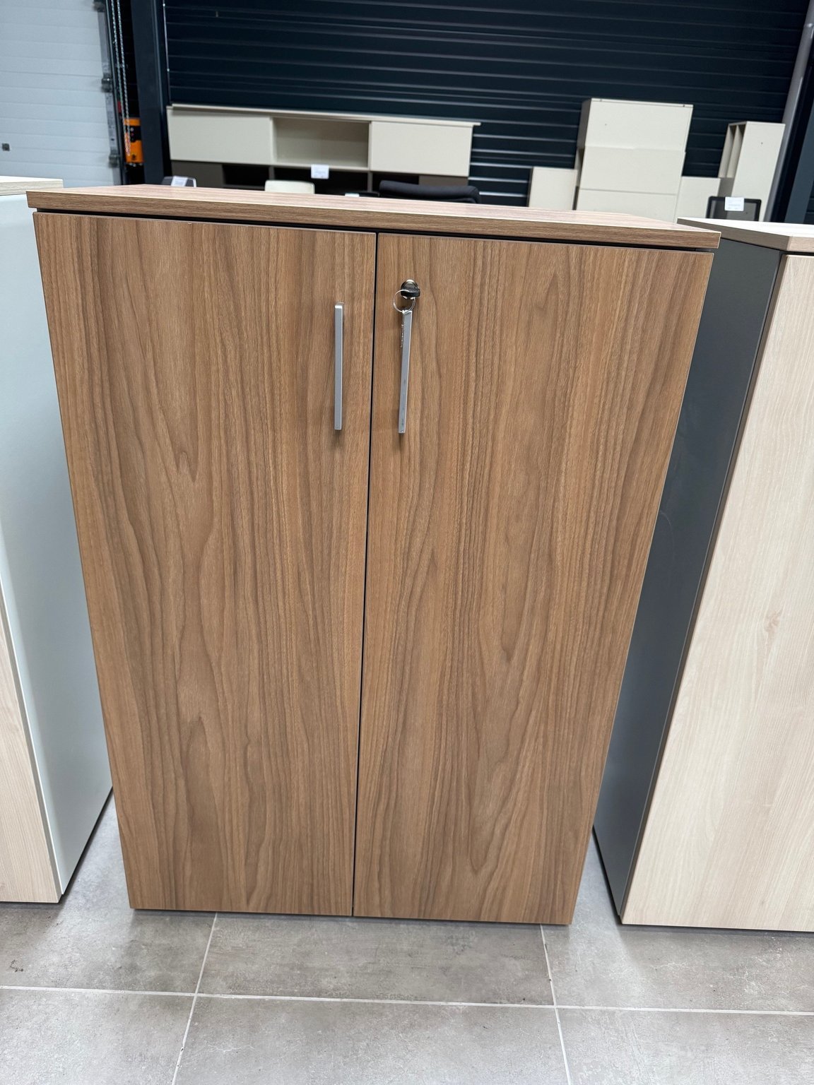 - Armoire 2 portes battantes en mélaminé hauteur 120 cm largeur 80 cm, finition noyer coffre couleur aluminium