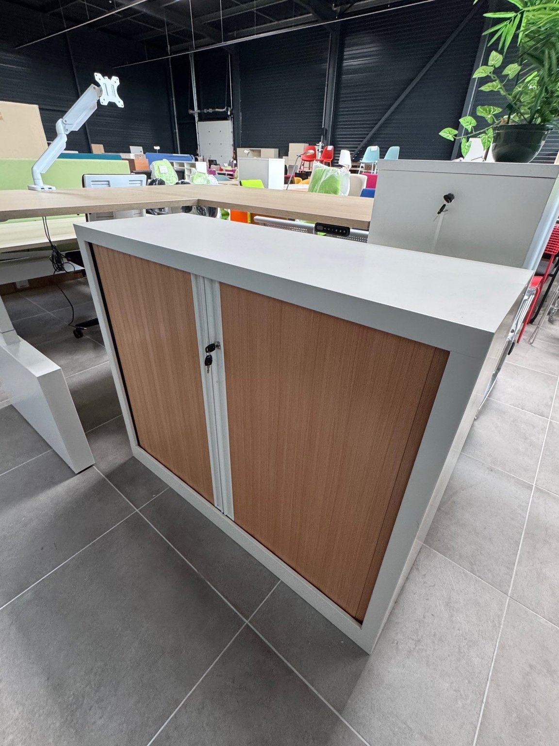 Armoire à rideaux basses coffre blanc et rideaux hêtre