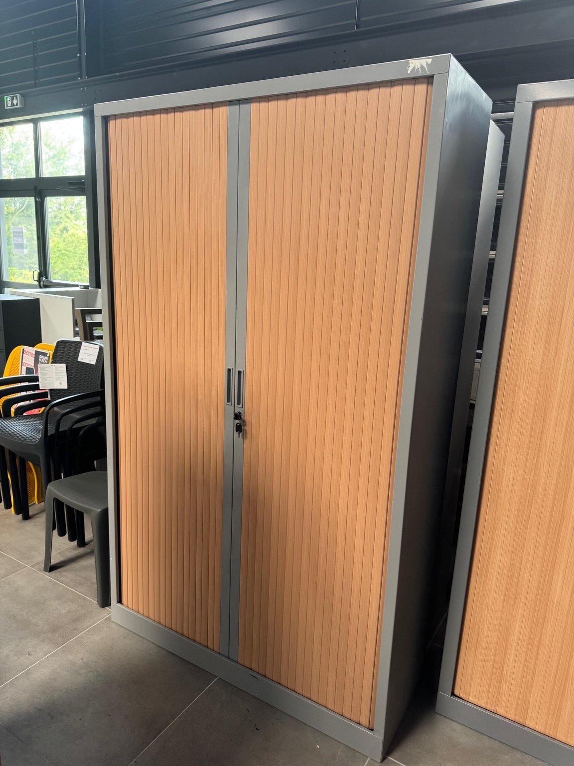 - Armoire haute à rideaux 198 x 120 cm déjà utilisé, coffre couleur aluminium et rideaux poirier