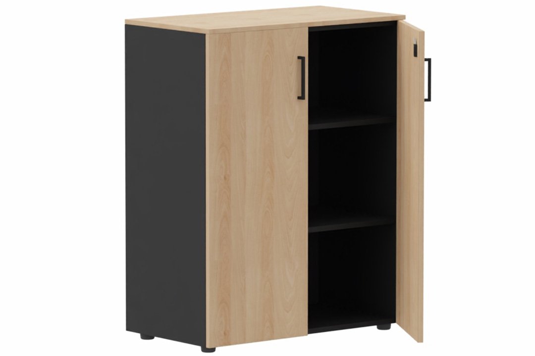 Armoire mélamine H102XL100 cm portes bois, Finitions= Top de finition : hêtre / Corps d'armoire et tablettes : noir / Façade : hêtre / Poignées noires