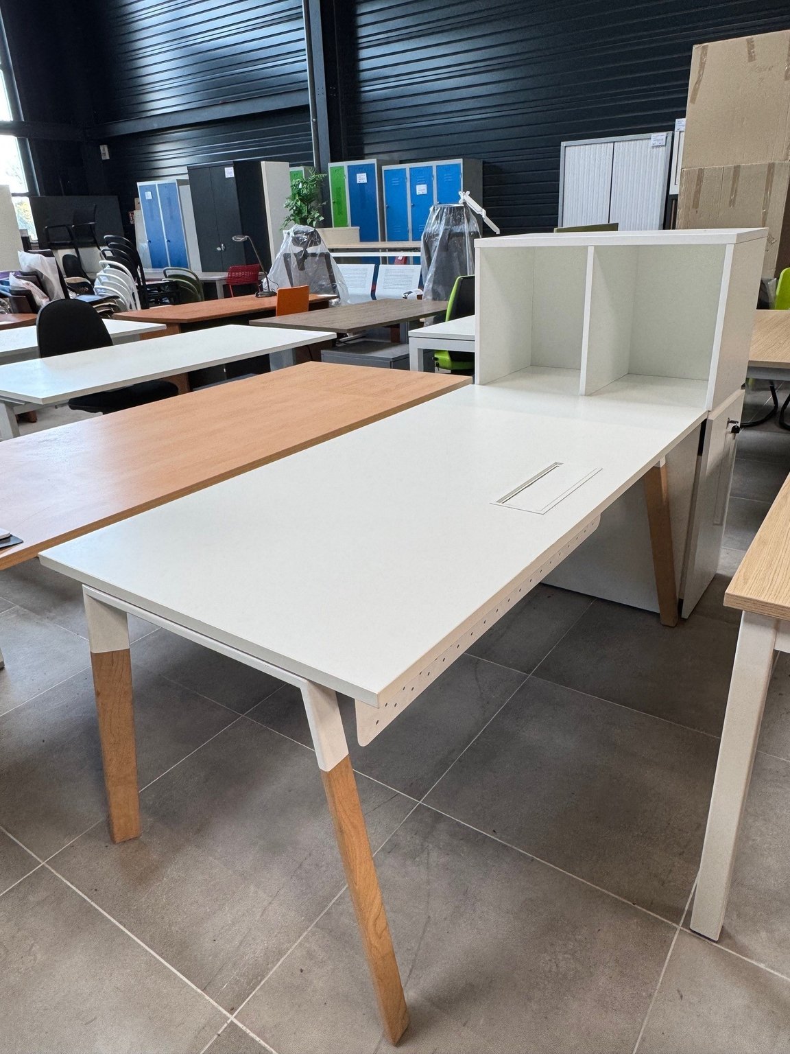 - Bureau 160 x 80 cm avec voile de fond, plateau blanc, piét. Blanc/bois avec niche et tour de rangement ouverture à droite