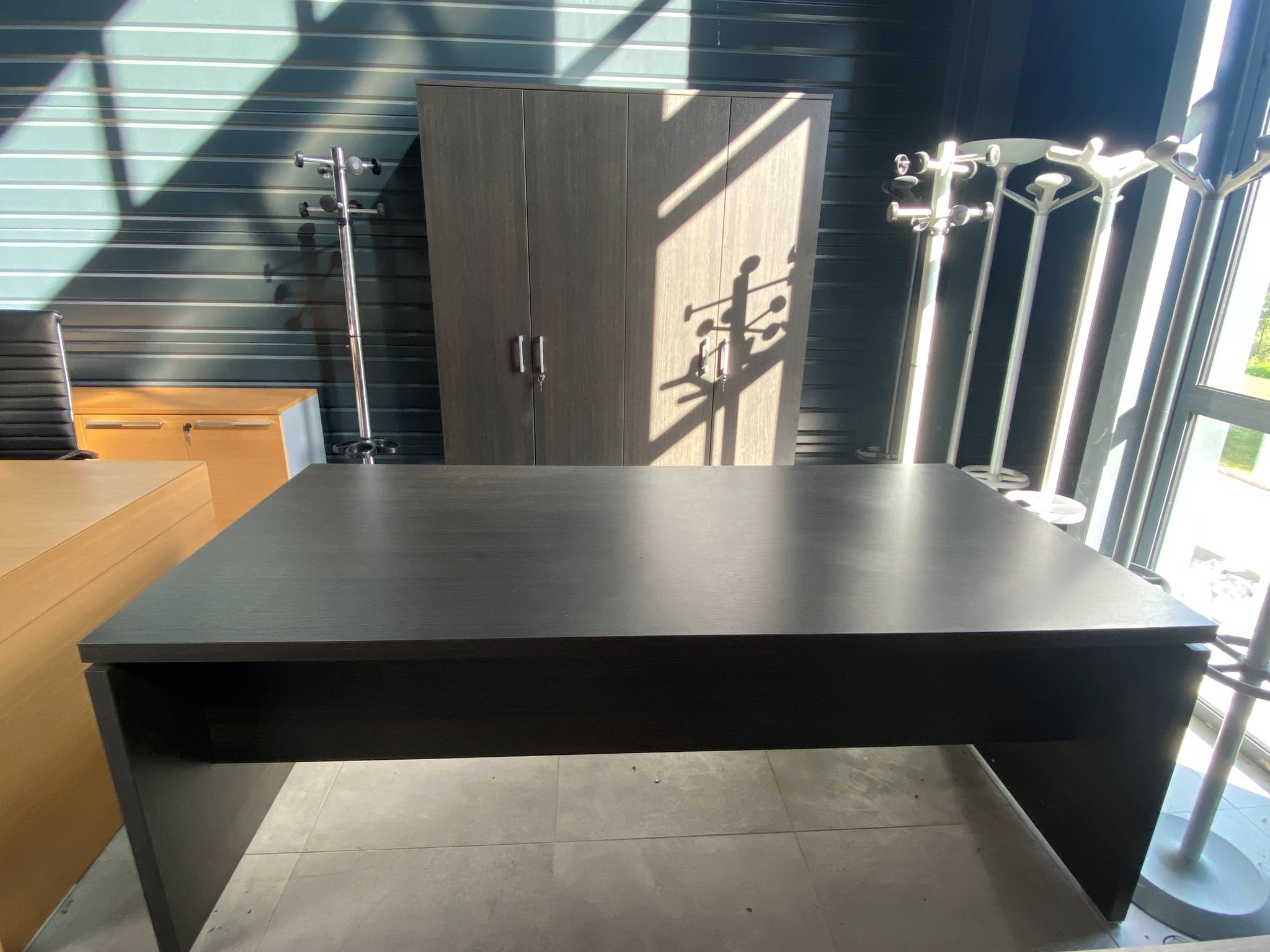 - Bureau de direction 200 x 100 cm avec armoire haute ht 200 cm 4 portes et VDF, finition wengé