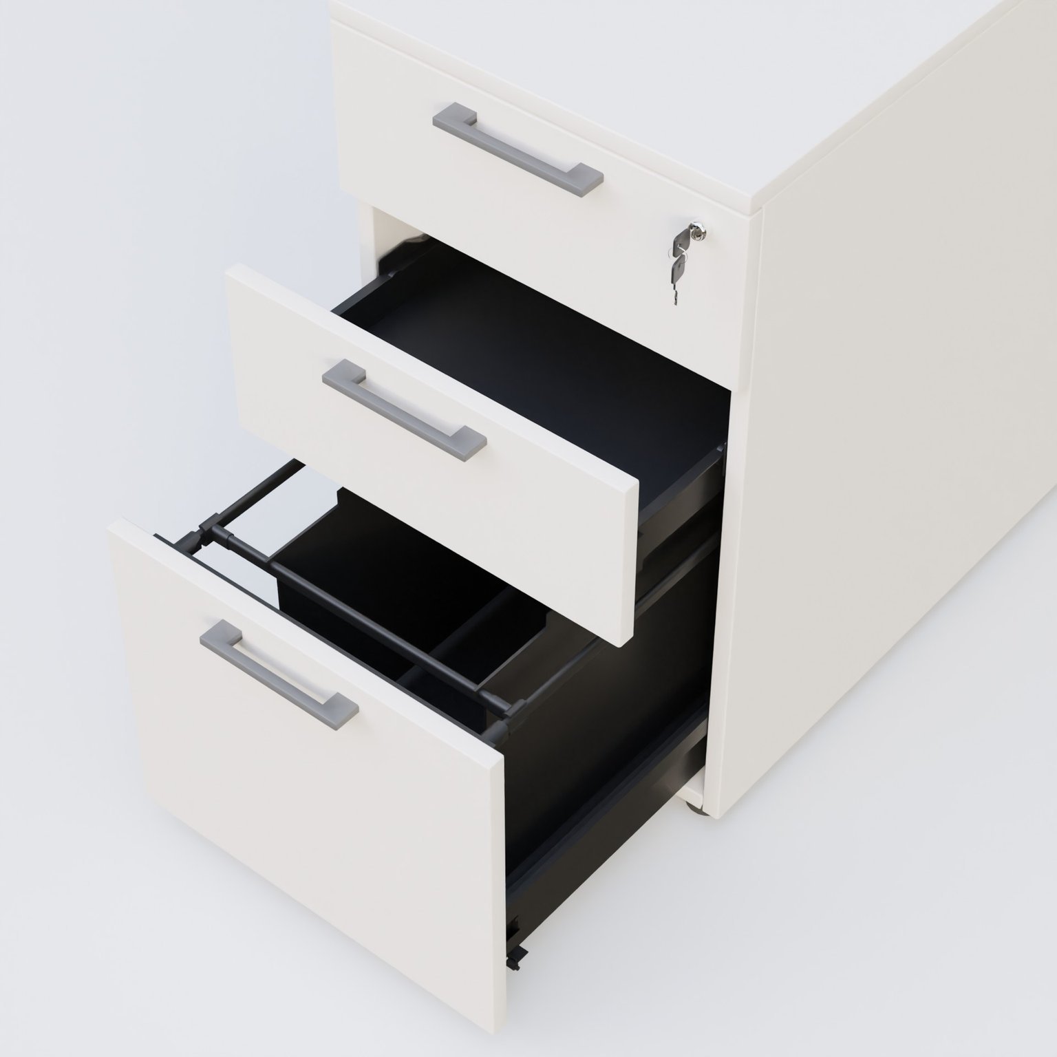 Caisson hauteur de bureau mélamine 3 tiroirs, profondeur 60cm. Caisson Blanc et poignets Aluminium.