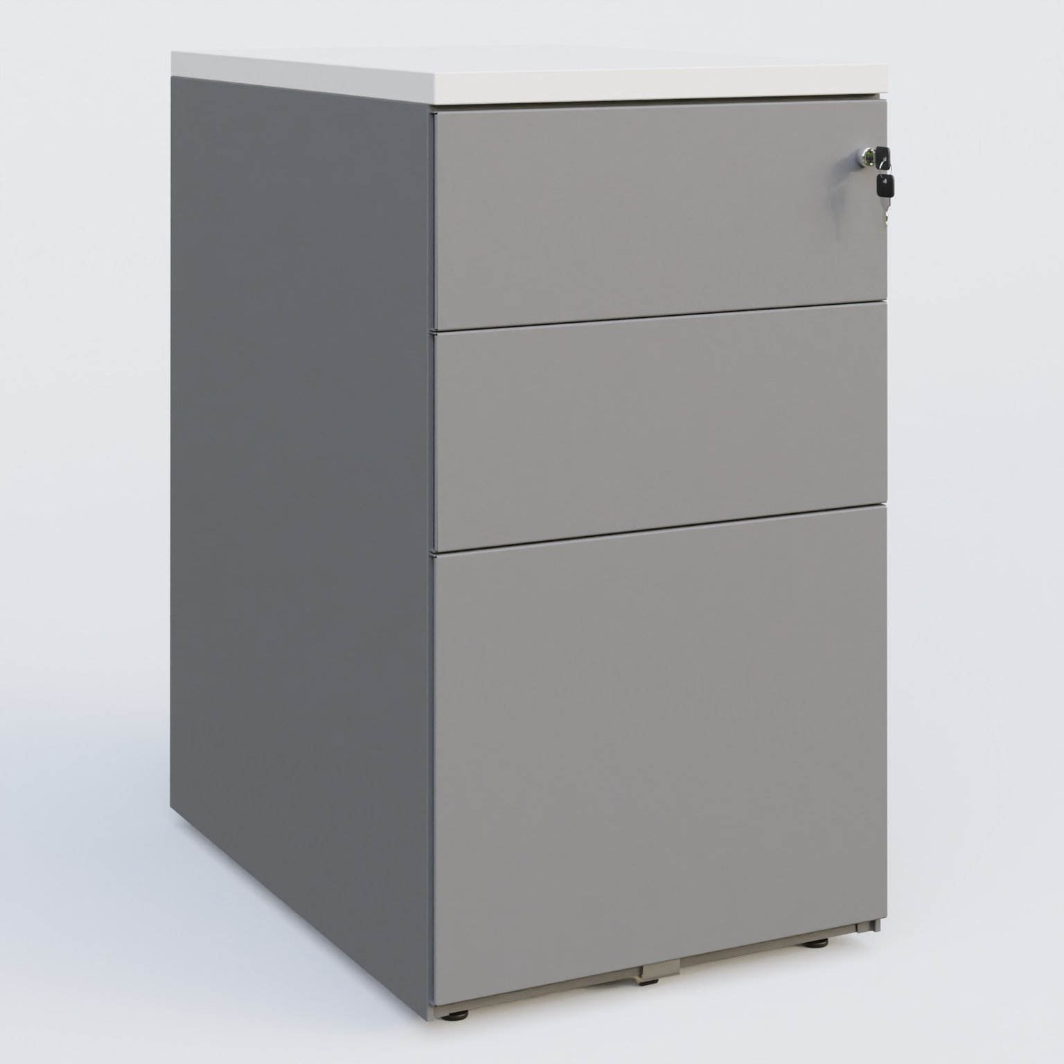 Caisson hauteur de bureau métalique 3 tiroirs avec top de finition, profondeur 60cm. Plateau Blanc et caisson Aluminium.