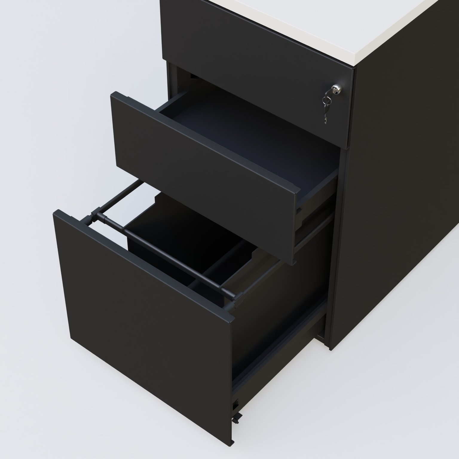 Caisson hauteur de bureau métalique 3 tiroirs avec top de finition, profondeur 60cm. Plateau Blanc et caisson Noir.
