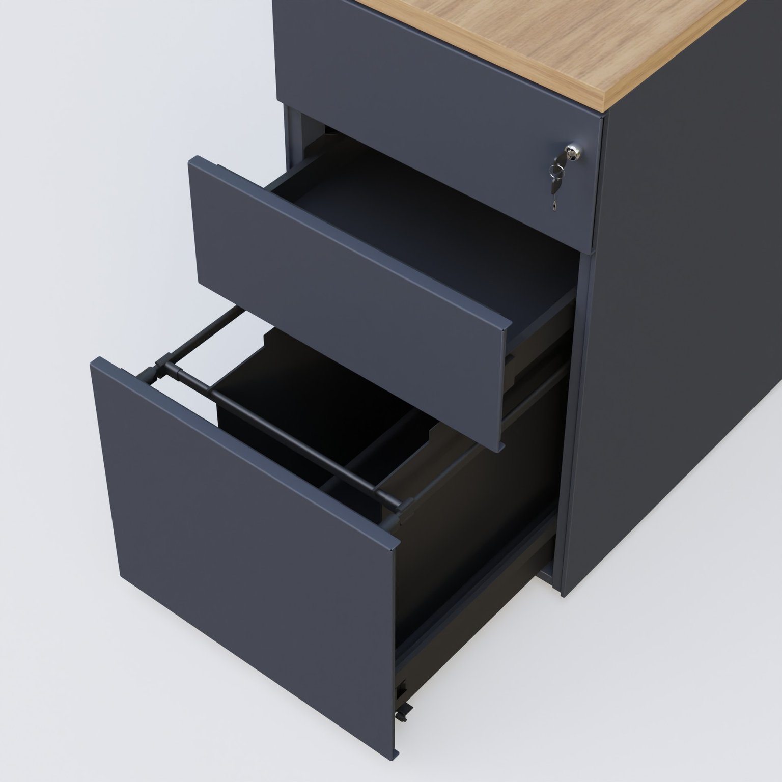 Caisson hauteur de bureau métalique 3 tiroirs avec top de finition, profondeur 60cm. Plateau Noyer et caisson Anthracite.