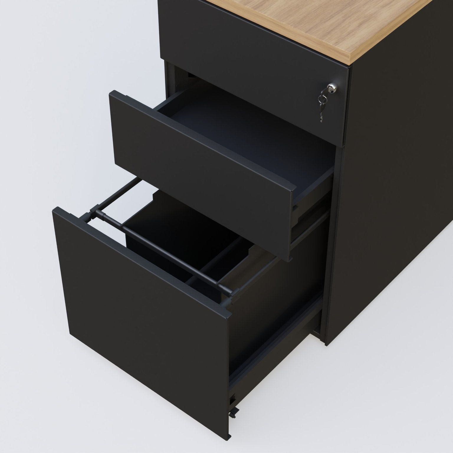 Caisson hauteur de bureau métalique 3 tiroirs avec top de finition, profondeur 60cm. Plateau Noyer et caisson Noir.