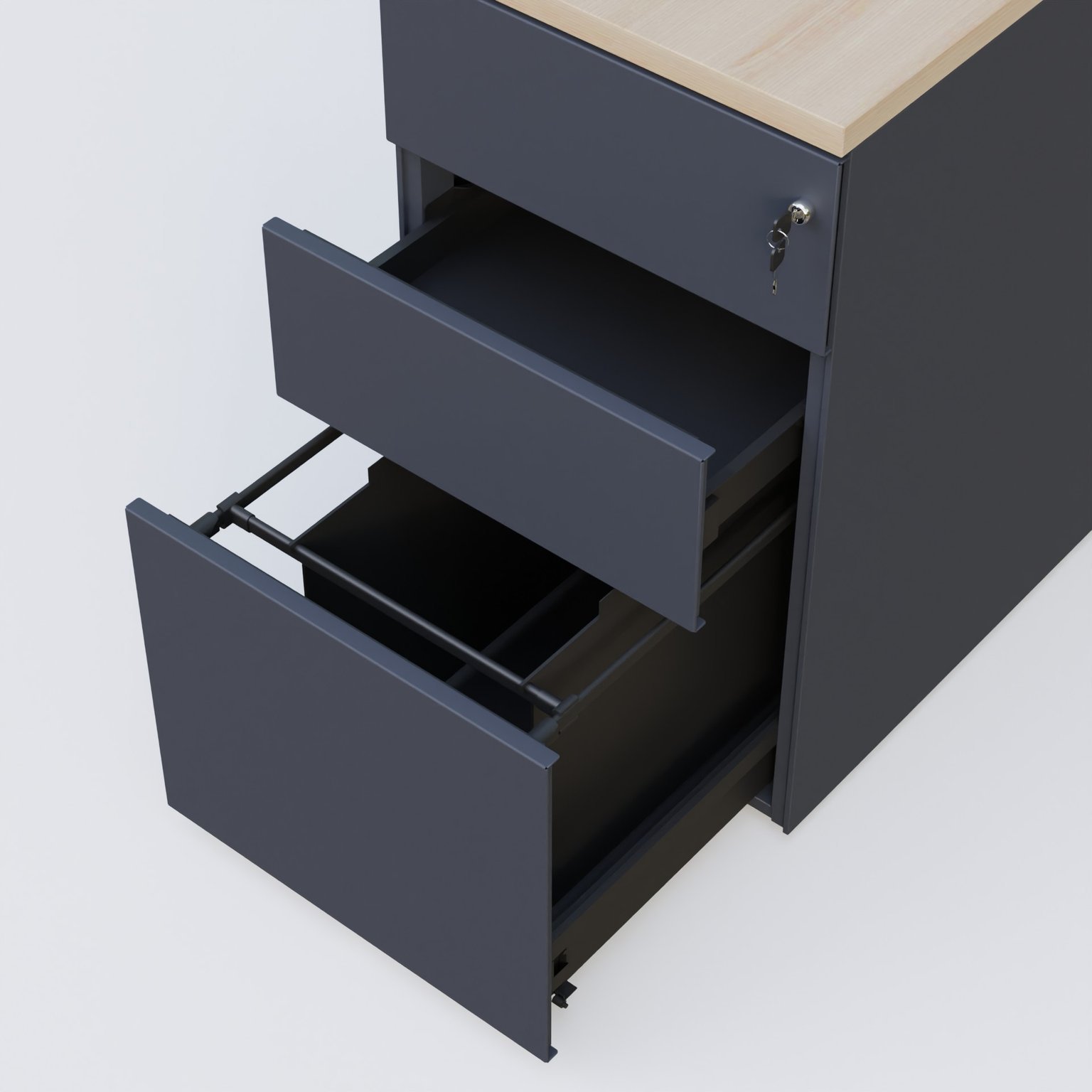 Caisson hauteur de bureau métalique 3 tiroirs avec top de finition, profondeur 80cm. Plateau Acacia et caisson Anthracite.
