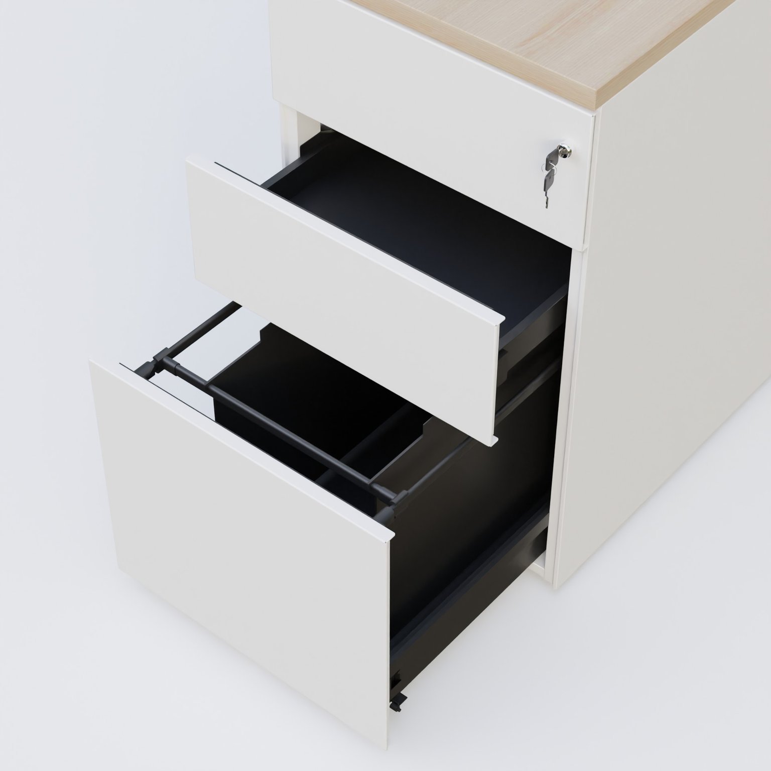 Caisson hauteur de bureau métalique 3 tiroirs avec top de finition, profondeur 80cm. Plateau Acacia et caisson Blanc.