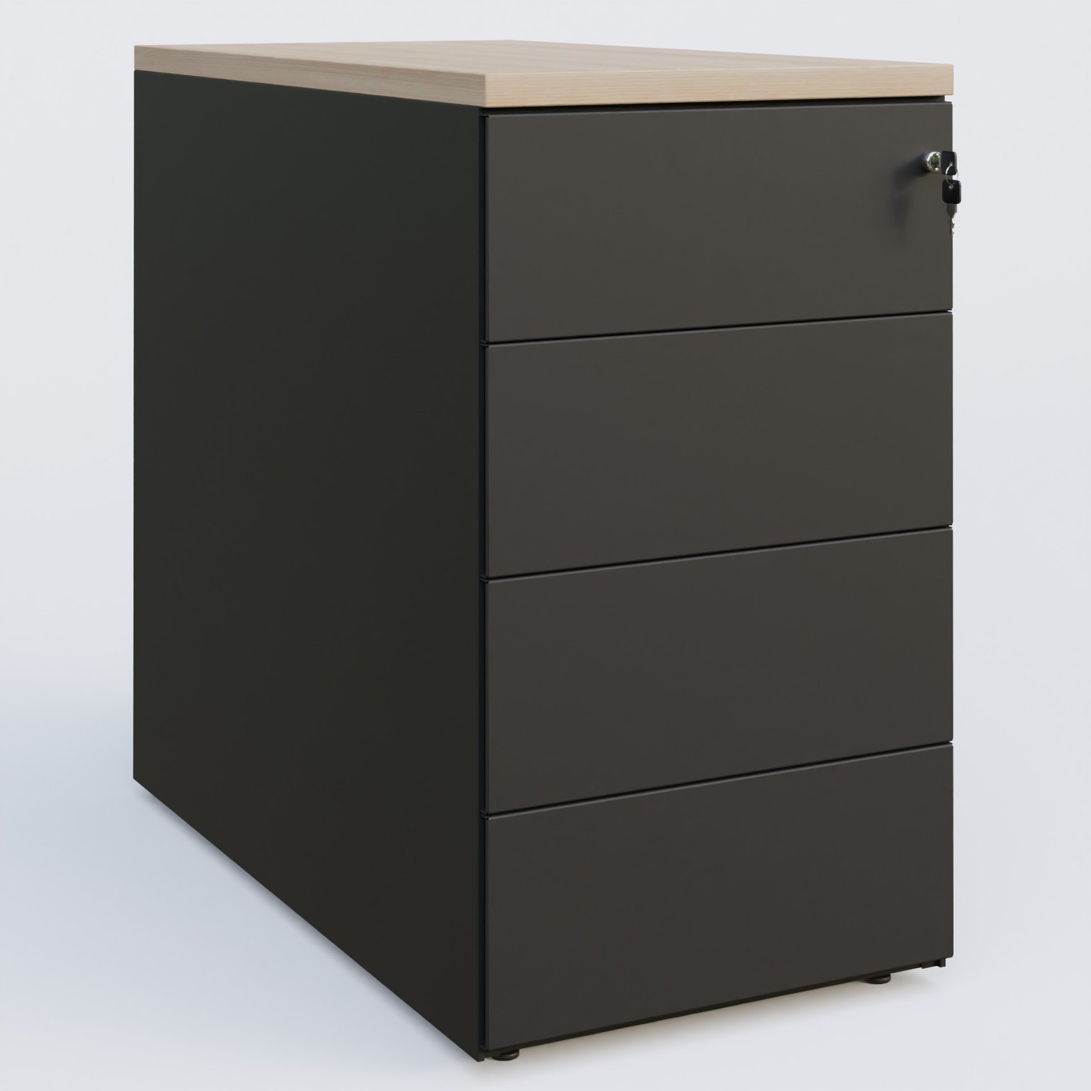 Caisson hauteur de bureau métalique 4 tiroirs avec top de finition, profondeur 60cm. Plateau Acacia et caisson Noir.