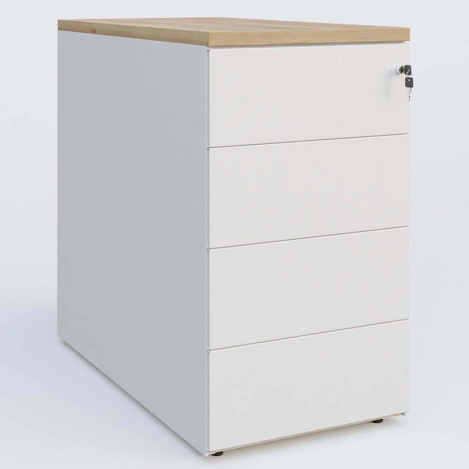 Caisson hauteur de bureau métalique 4 tiroirs avec top de finition, profondeur 60cm. Plateau Chêne naturel et caisson Blanc.