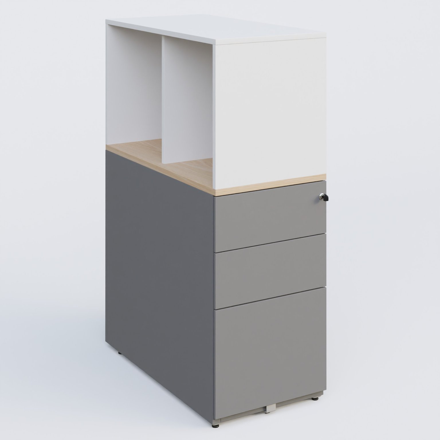 Caisson HB 3 tiroirs avec niche. Caisson Aluminium top de finition Hêtre et niche blanche.