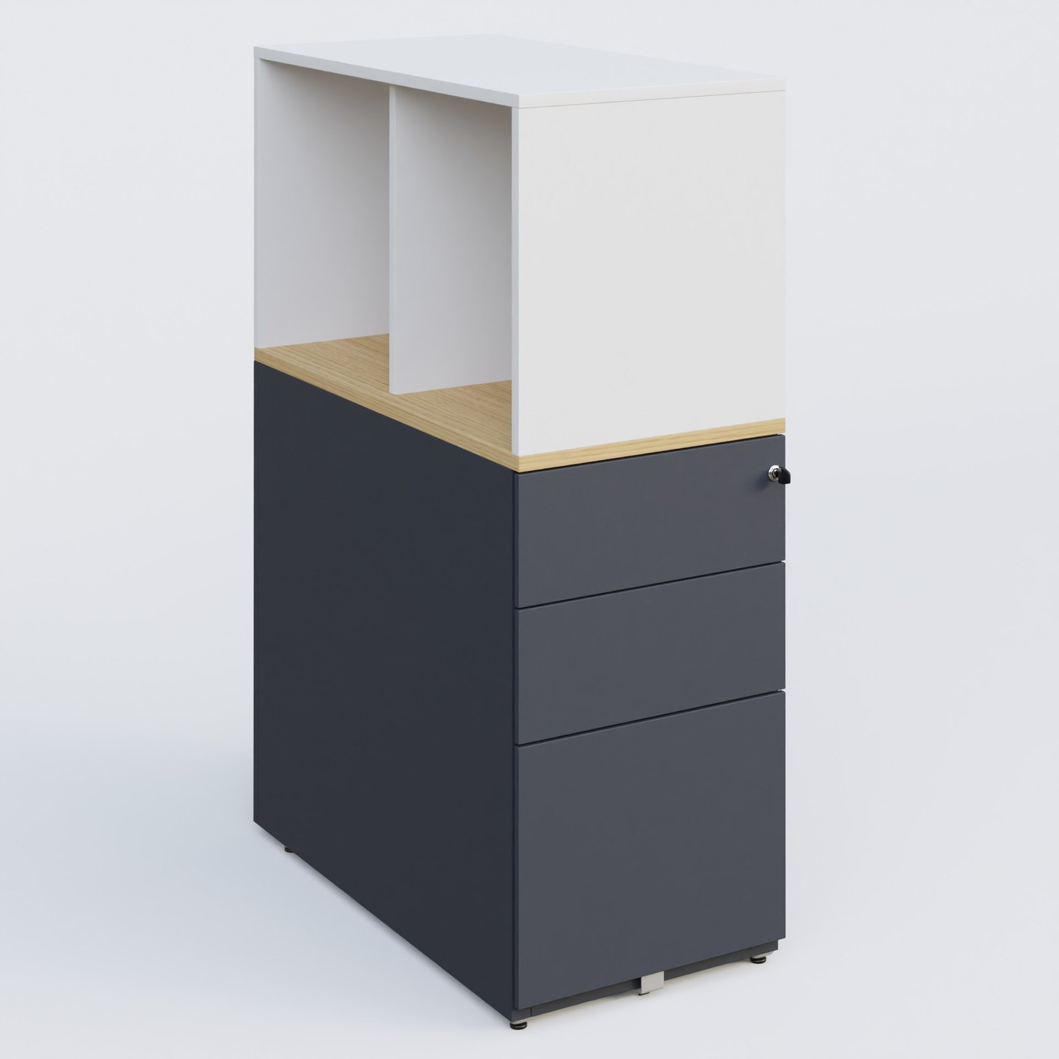 Caisson HB 3 tiroirs avec niche. Caisson Anthracite top de finition Chêne clair et niche blanche.