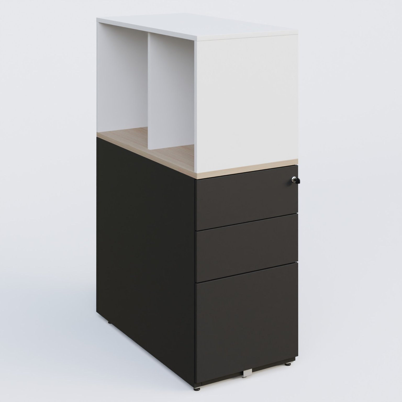 Caisson HB 3 tiroirs avec niche. Caisson Noir Grainé top de finition Acacia et niche blanche.