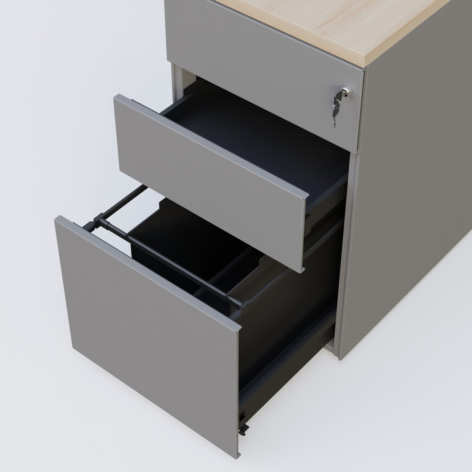 Caisson métal hauteur bureau P. 60 cm 3 tiroirs avec top L.42xP.60xH.70cm, corps aluminium, top acacia