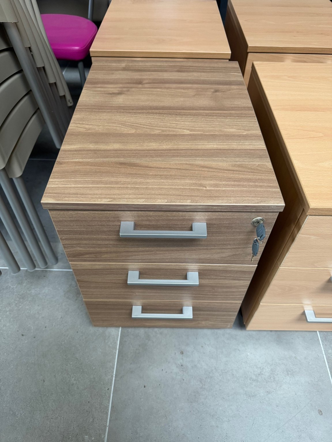 Caisson mobile en mélaminé noyer largeur 42 cm, 3 tiroirs poignées couleur aluminium