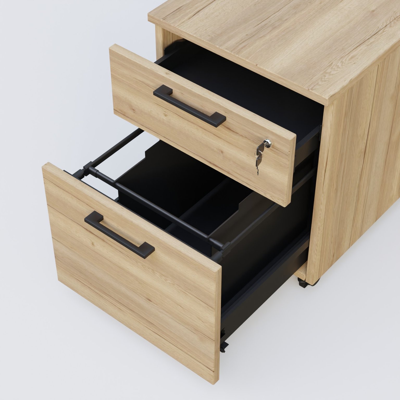 Caisson mobile mélamine 2 tiroirs, hauteur 55 cm. Caisson Chêne clair et poignets Noir. cheneCe