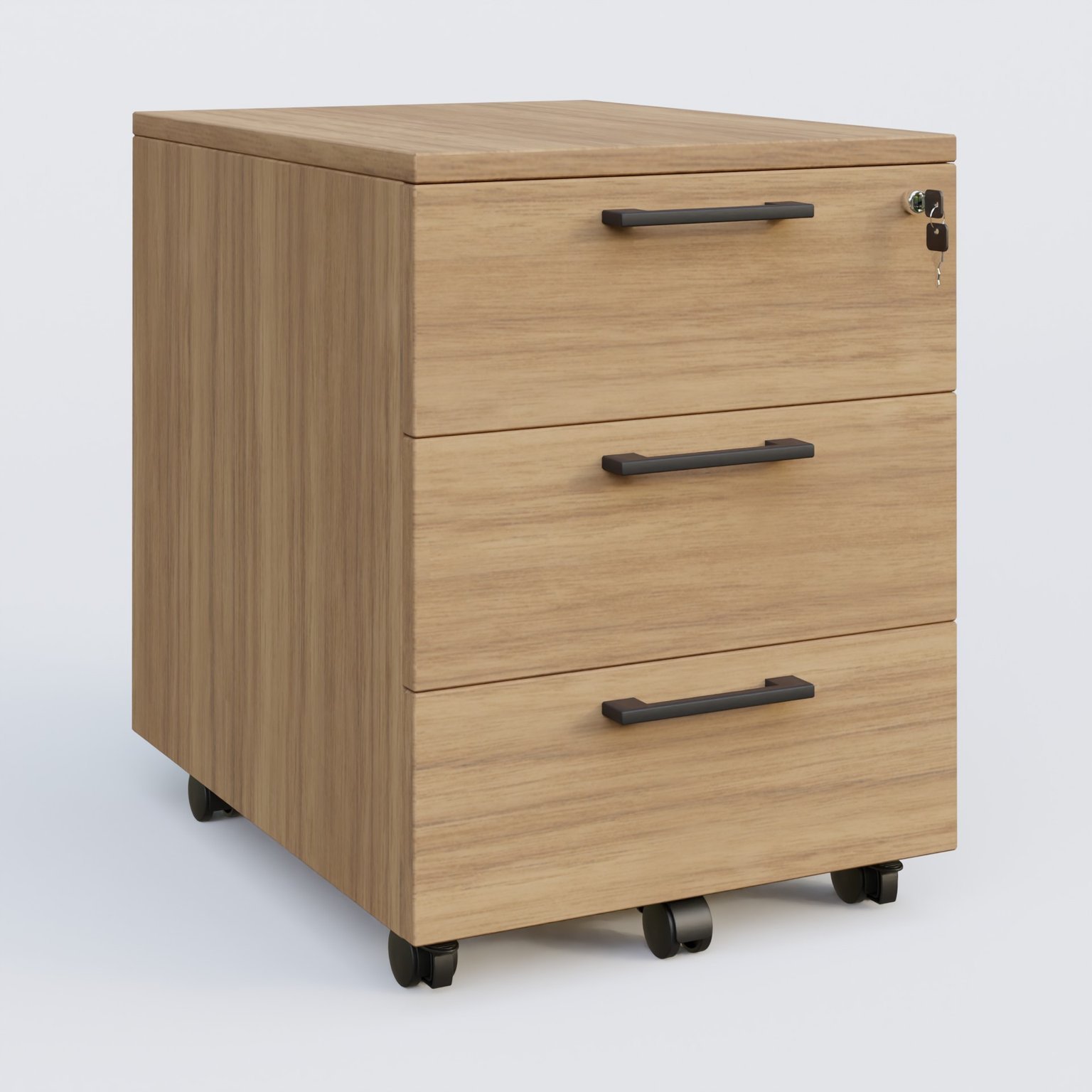 Caisson mobile mélamine 3 tiroirs, hauteur 55 cm. Caisson Chêne naturel et poignets Noir. cheneNaturelMh84