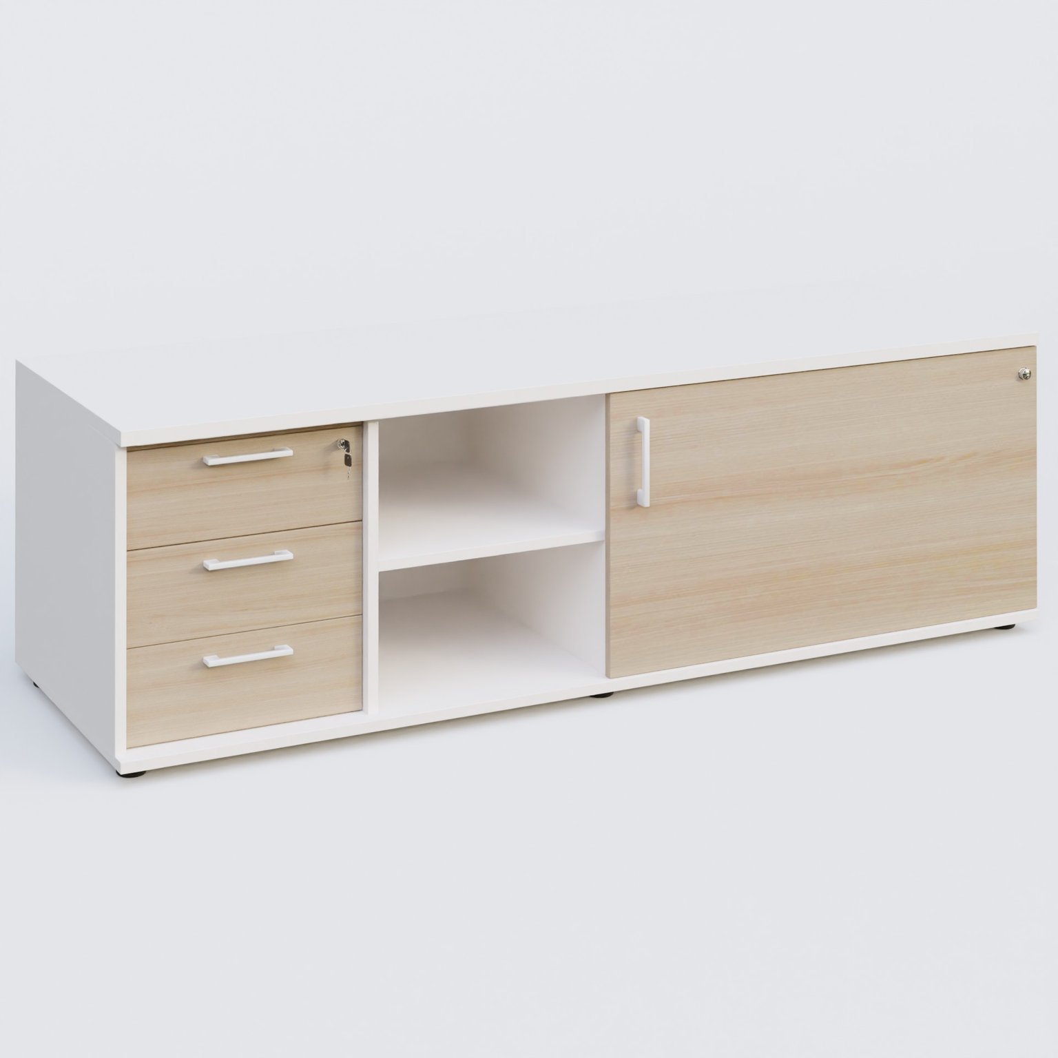 Caisson USE ME avec caisson trois tiroirs, porte à droite. Caisson Blanc et portes Acacia.