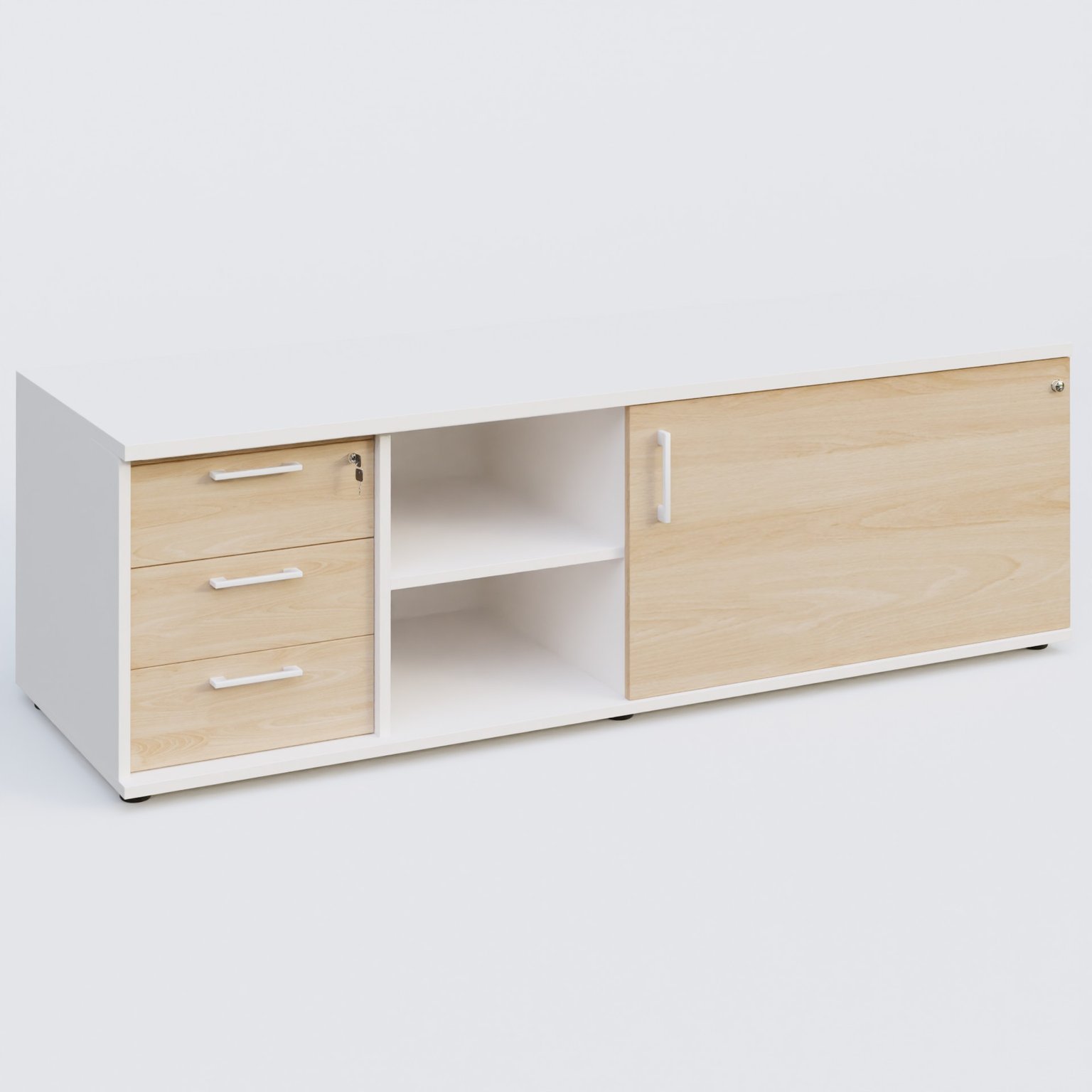 Caisson USE ME avec caisson trois tiroirs, porte à droite. Hauteur 57 cm, profondeur 62 cm et largeur 180 cm.