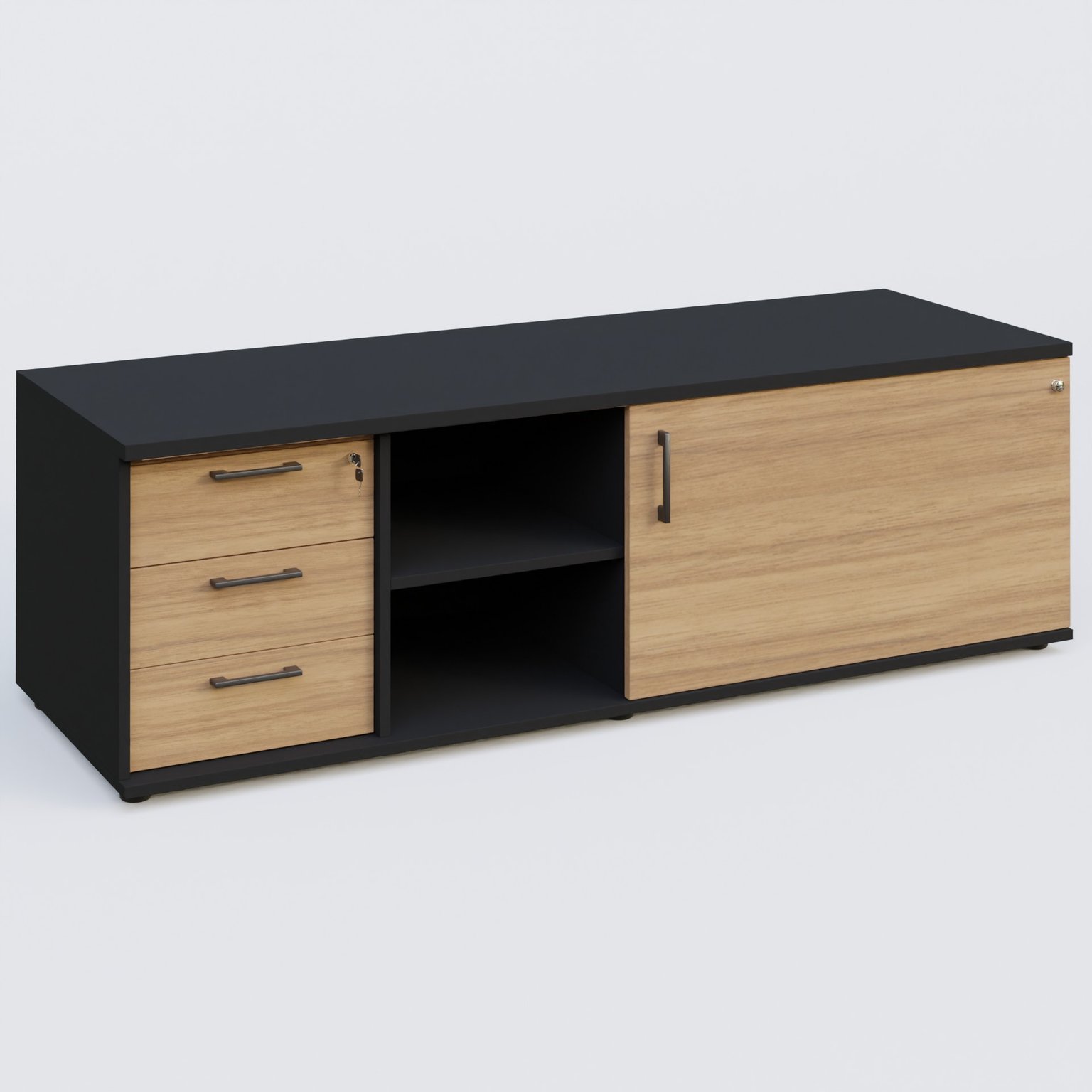 Caisson USE ME avec caisson trois tiroirs, porte à droite. Caisson Noir et portes Noyer.