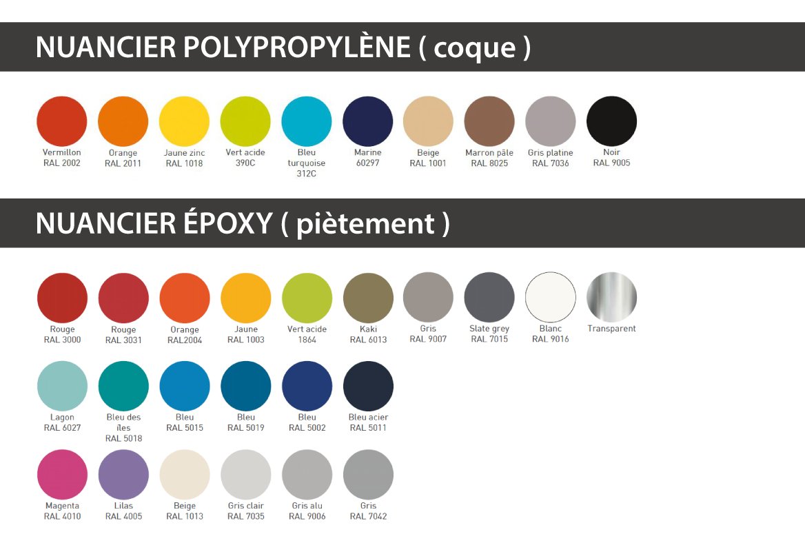 - Coque polypropylène et piètement époxy coloris selon nuancier.