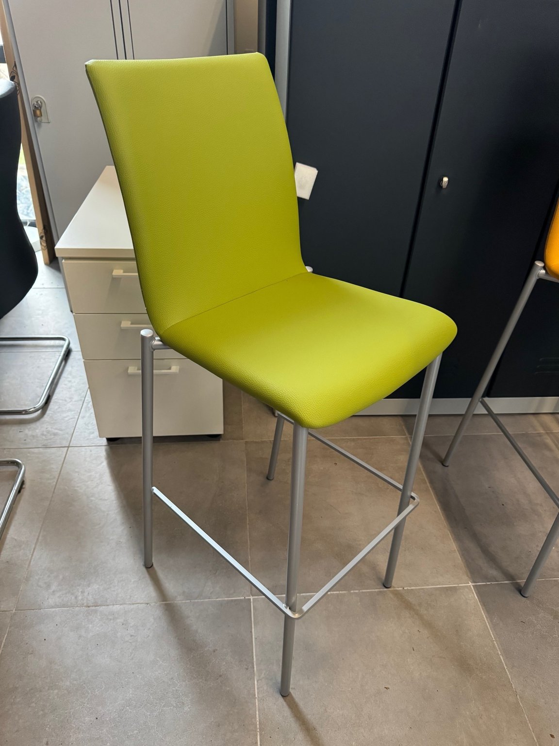 - Chaise hauteur 80 cm assise tissu enduit vert, structure 4 pieds couleur aluminium