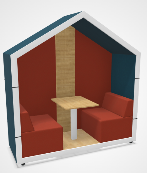 COTTAGE DUO "avec fond" revêtu de tissu avec table plateau blanc épaisseur 18mm, banquettes intégrées, murs intérieurs et extérieurs en tissu, L.210xP.78xH.228cm, 4 roulettes dont 2 avec frein