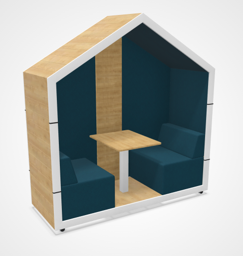 - COTTAGE DUO "avec fond" revêtu de tissu avec table plateau blanc épaisseur 18mm, murs extérieurs en pin, banquettes intégrées, murs intérieurs et fond en tissu, L.210xP.78xH.228cm, 4 roulettes dont 2 avec frein