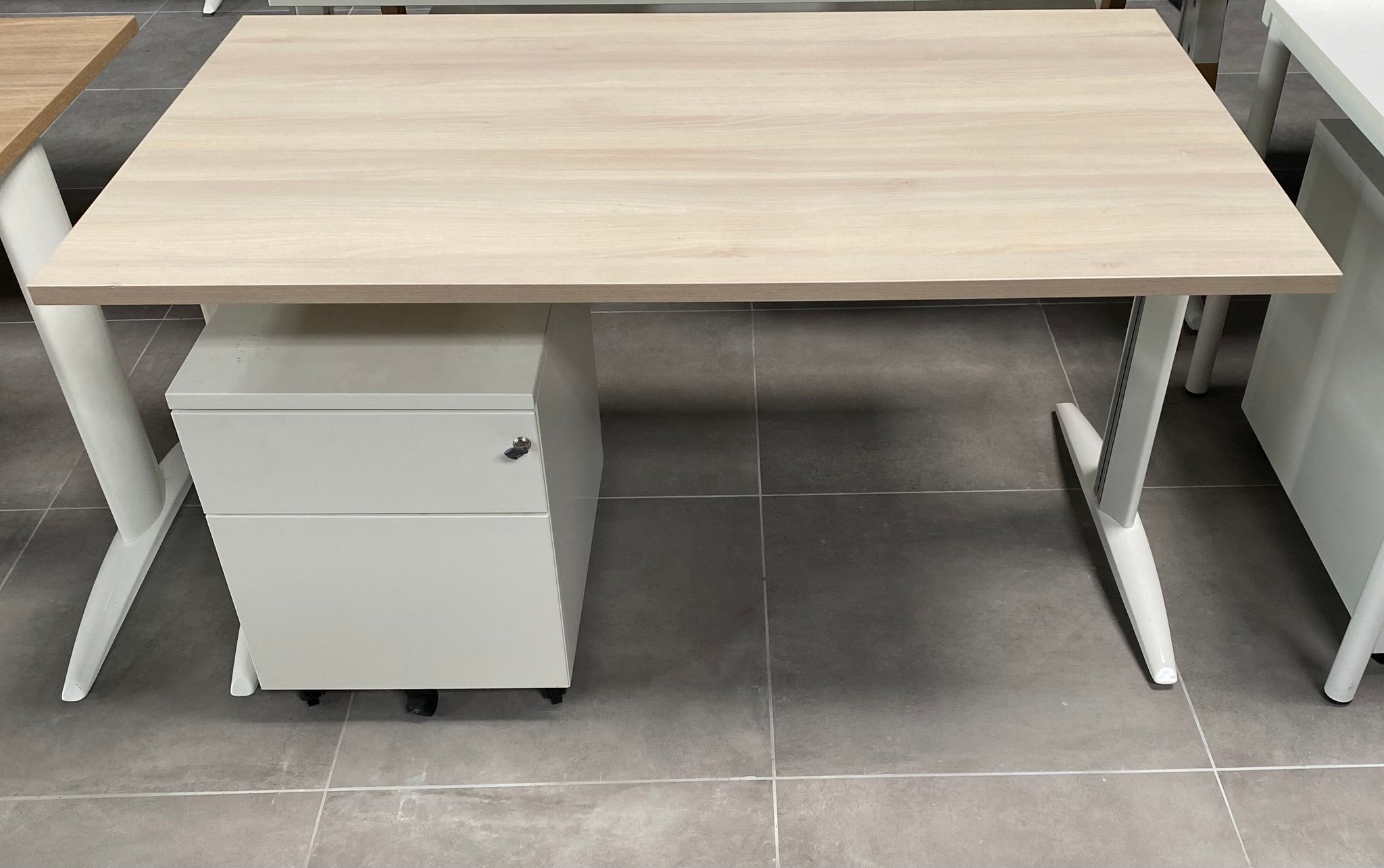 - Ensemble Bureau 140x80 Piètement Blanc / Plateau Acacia, Caisson Blanc