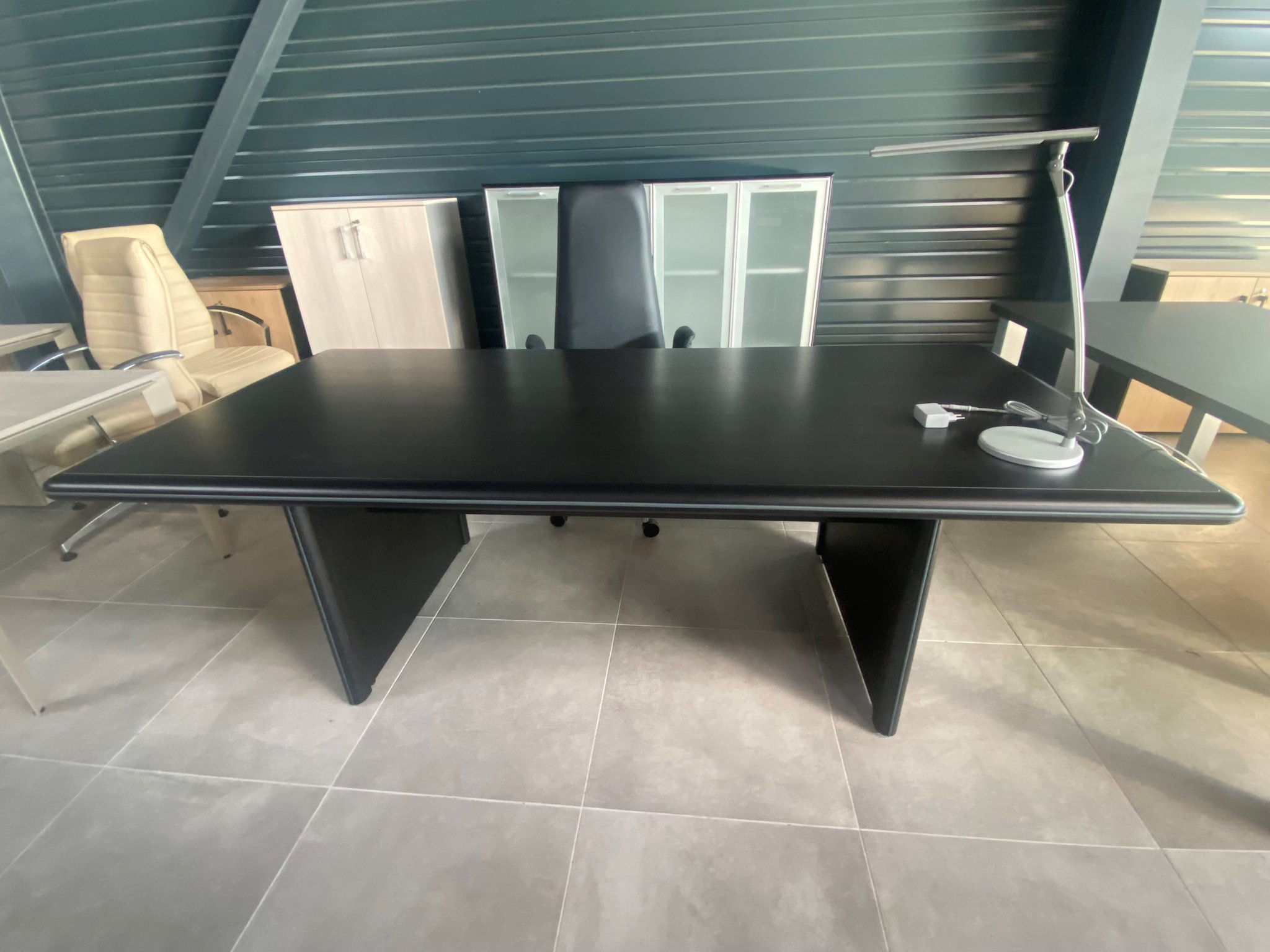 - Ensemble de direction 230 x 110 cm revêtu de bois de placage frêne noir avec VDF et deux armoires