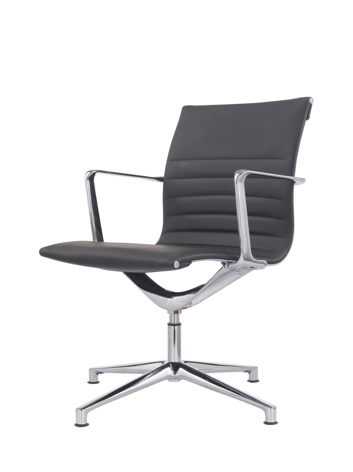 Fauteuil moyen dossier PURE, hauteur d'assise et dossier fixes, retour point fixe, revêtement CUIR pleine fleur coloris noir, piétement fixe 4 branches aluminium poli