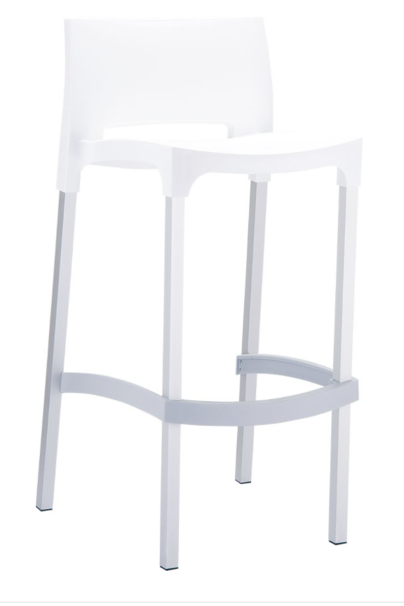 - GALICE-Chaise haute en polypropylène recyclable. Pieds en aluminium anodisé 25x25mm. Usage intérieur et extérieur. Empilable par 4. Coloris blanc