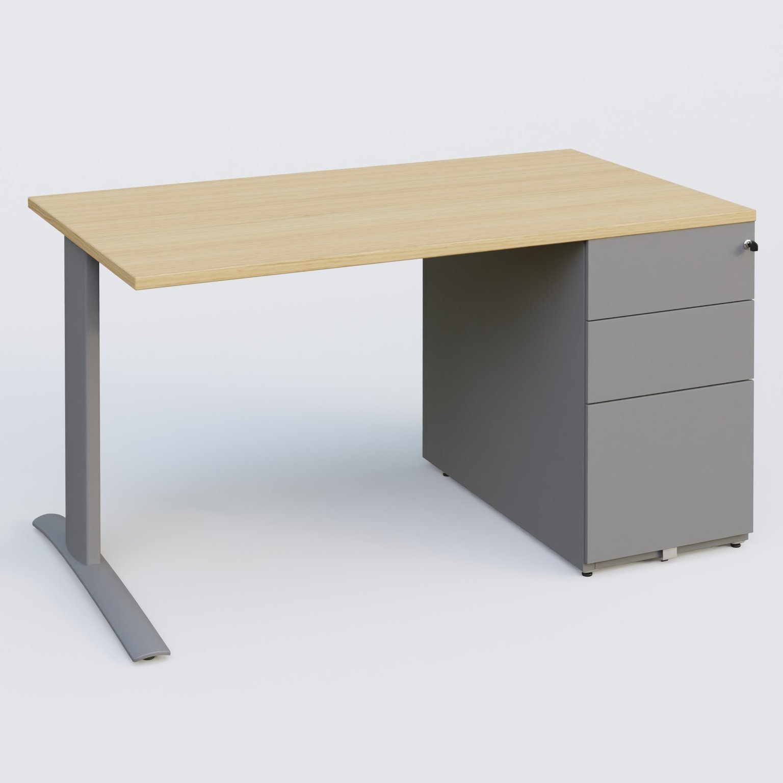 K1 Plateau droit 140x80 avec caisson métal porteur sous plateau à droite. Plateau Chêne clair et pietement Aluminium
