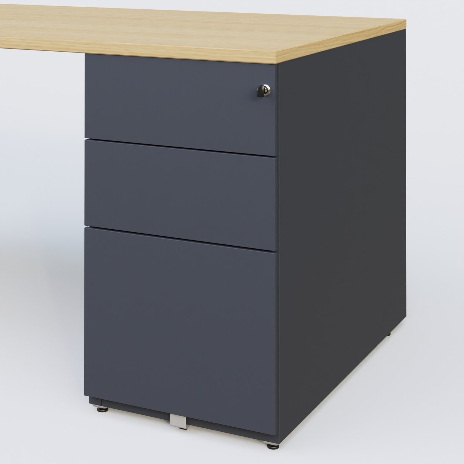 Plan droit mélamine en 25 mm avec caisson métal 3 tiroirs porteur sous plateau à droite qui remplace un pied.