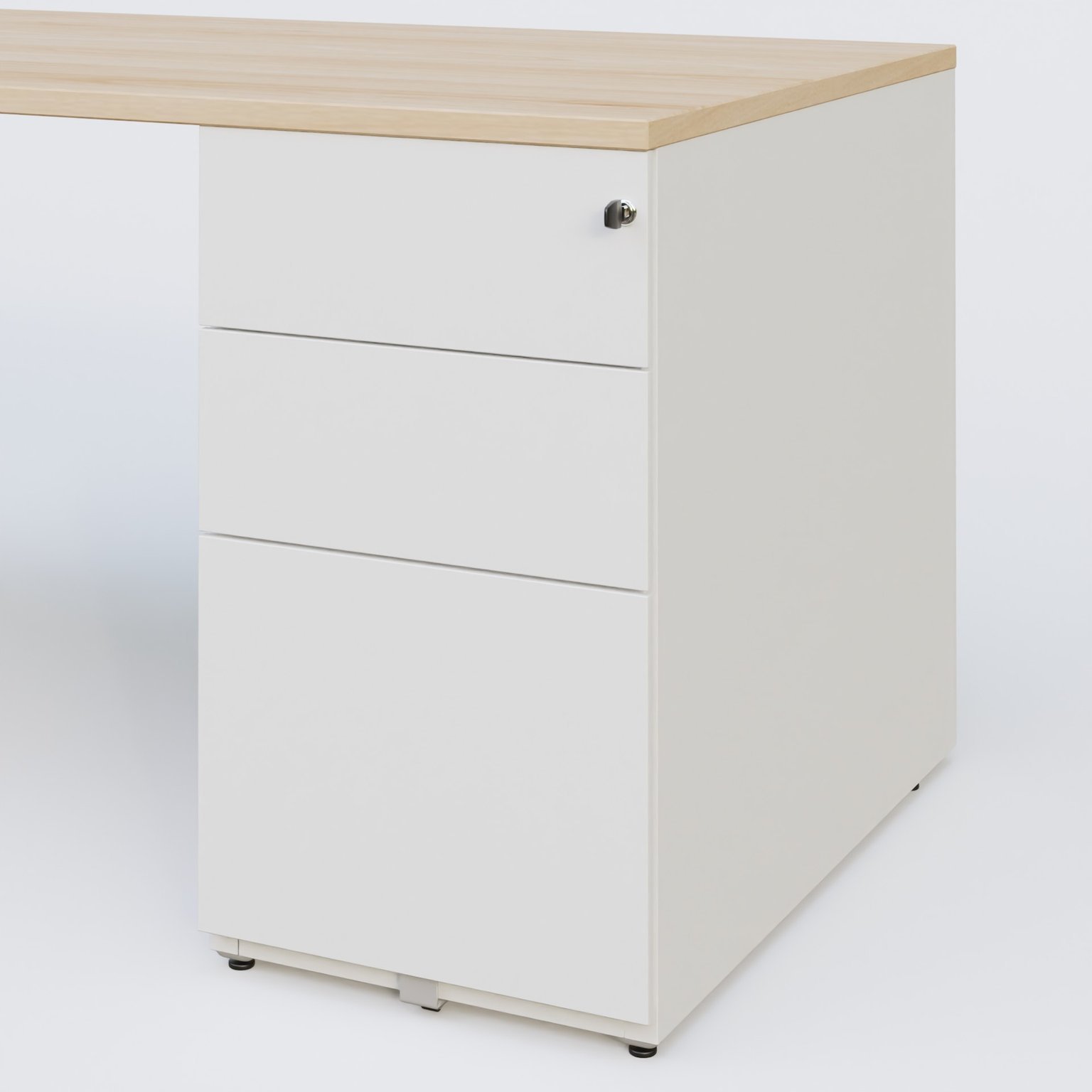 Plan droit mélamine en 25 mm avec caisson métal 3 tiroirs porteur sous plateau à droite qui remplace un pied.