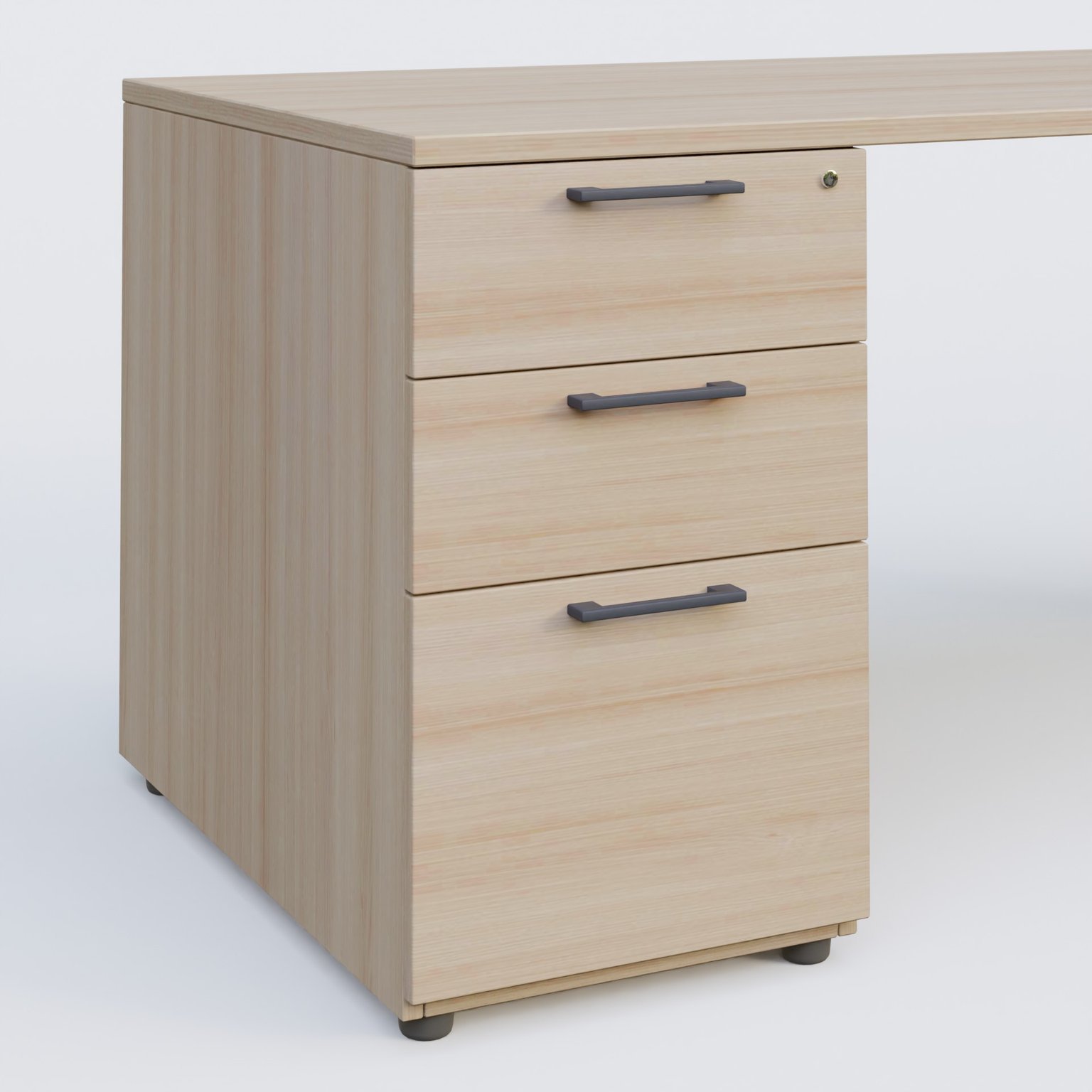 Plan droit mélamine en 25 mm avec caisson 3 tiroirs porteur sous plateau mélamine à gauche qui remplace un pied.