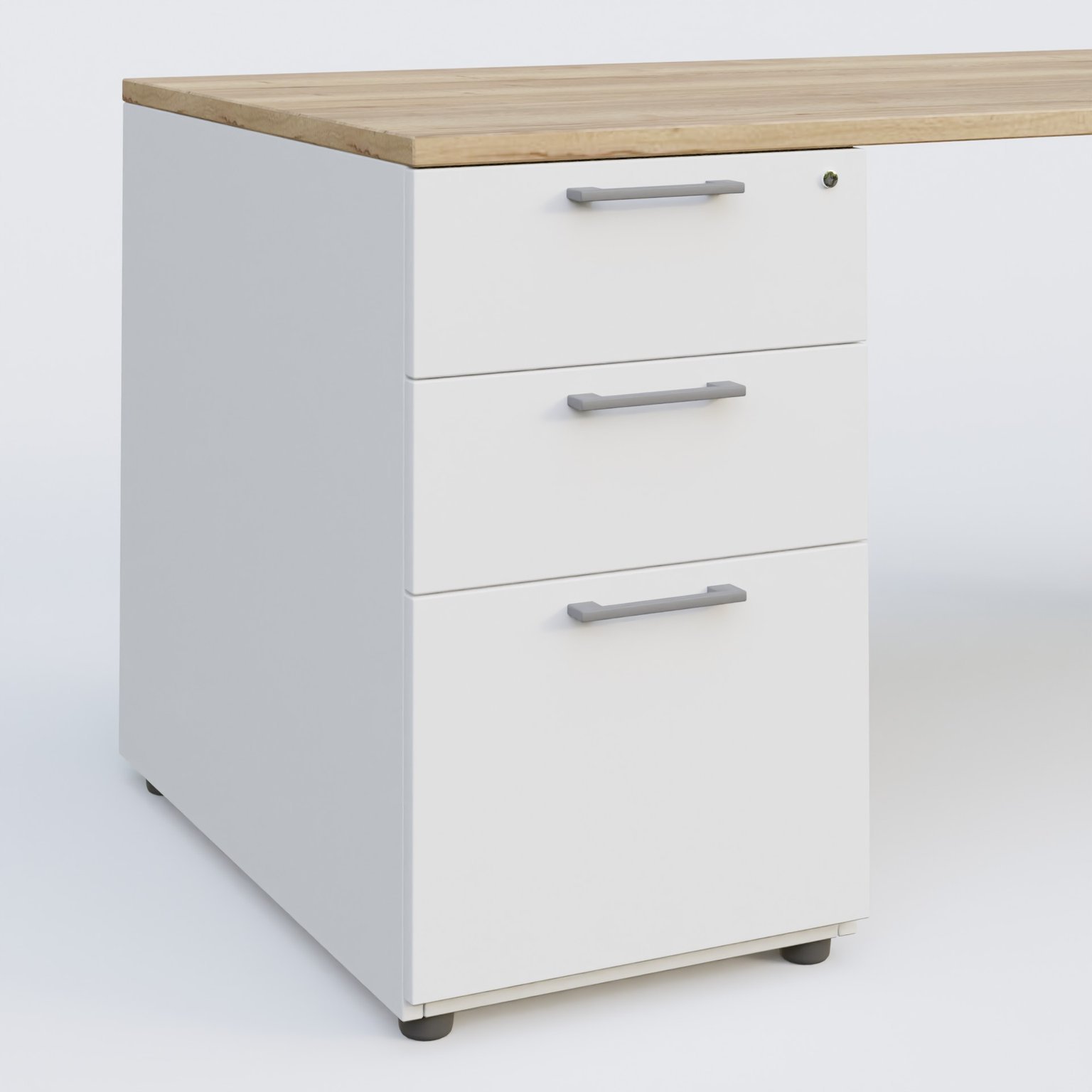 Plan droit mélamine en 25 mm avec caisson 3 tiroirs porteur sous plateau mélamine à gauche qui remplace un pied.