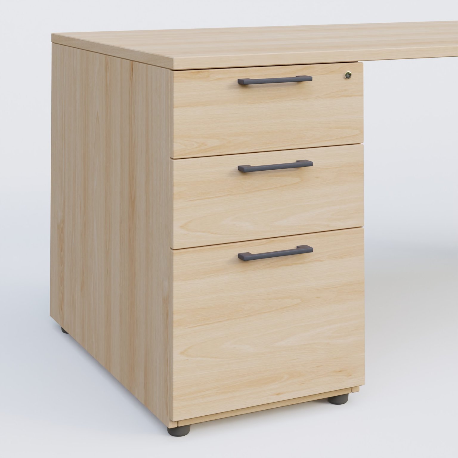 Plan droit mélamine en 25 mm avec caisson 3 tiroirs porteur sous plateau mélamine à gauche qui remplace un pied.