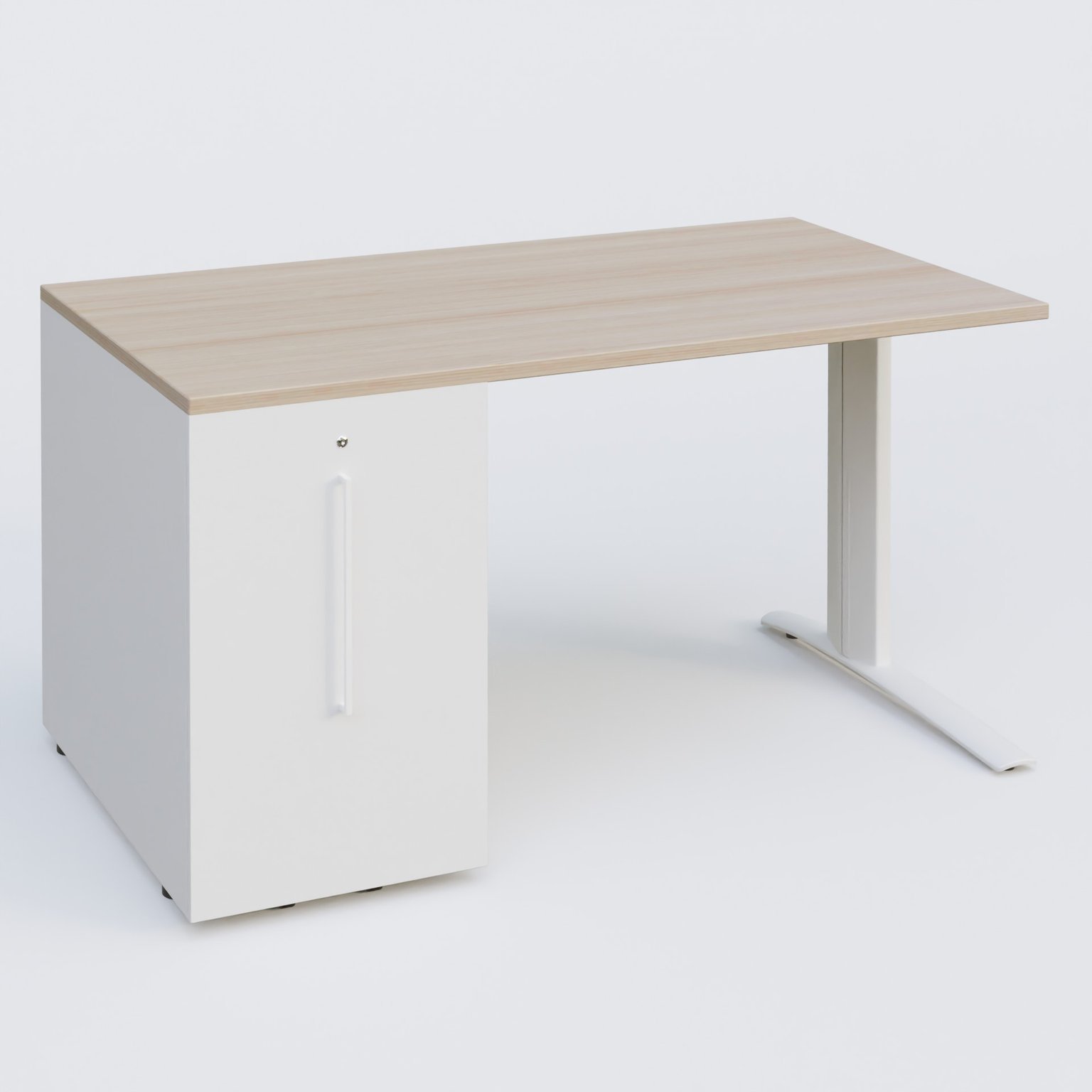 K1 Plateau droit 140x80 avec tour de rangement sous plateau à gauche. Plateau Acacia et pietement Blanc