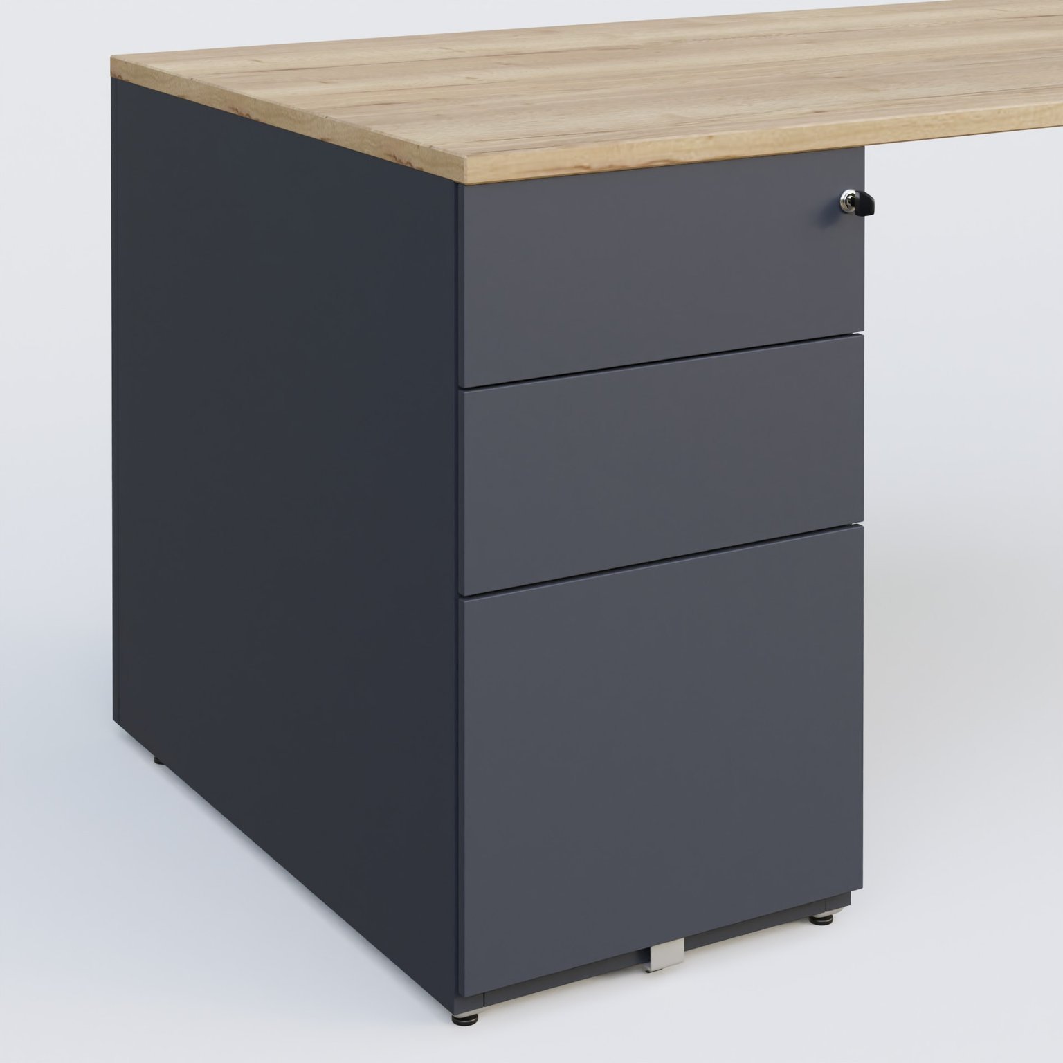Plan droit mélamine en 25 mm avec caisson métal 3 tiroirs porteur sous plateau à gauche qui remplace un pied.