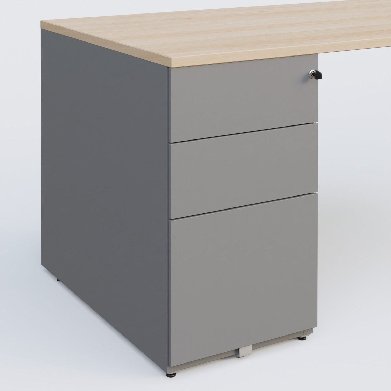 Plan droit mélamine en 25 mm avec caisson métal 3 tiroirs porteur sous plateau à gauche qui remplace un pied.
