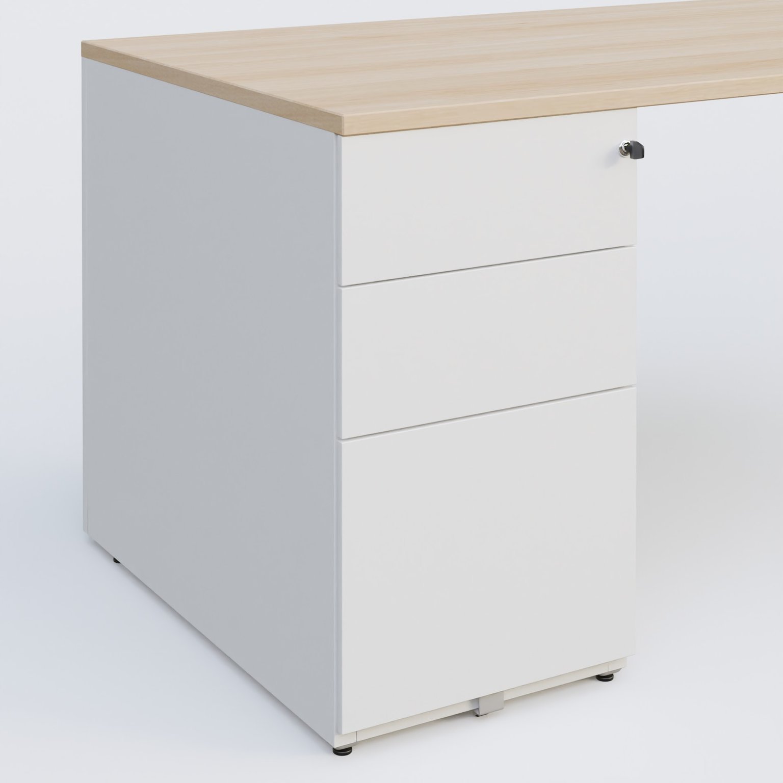 Plan droit mélamine en 25 mm avec caisson métal 3 tiroirs porteur sous plateau à gauche qui remplace un pied.