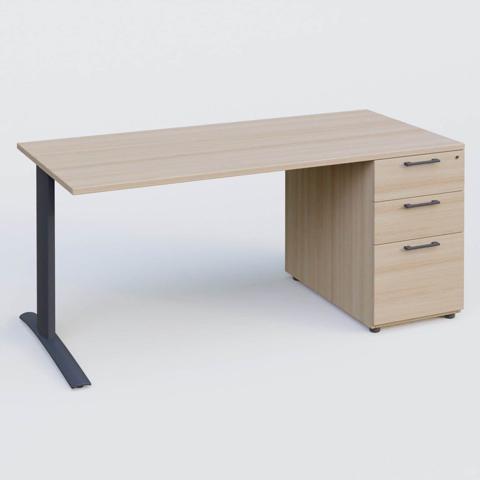 K1 Plateau droit 160x80 avec caisson porteur sous plateau mélamine à droite. Plateau Acacia et pietement Anthracite