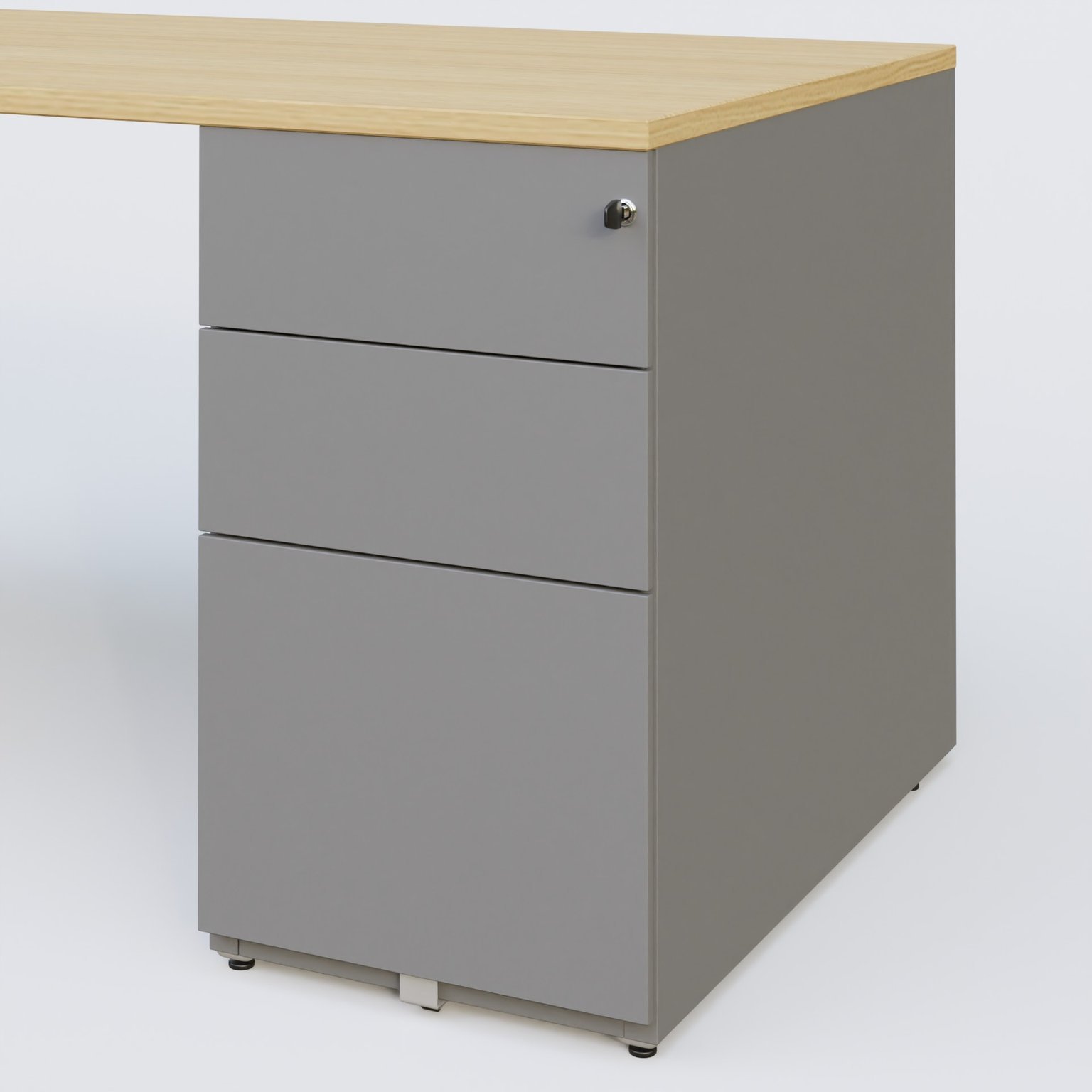 Plan droit mélamine en 25 mm avec caisson métal 3 tiroirs porteur sous plateau à droite qui remplace un pied.