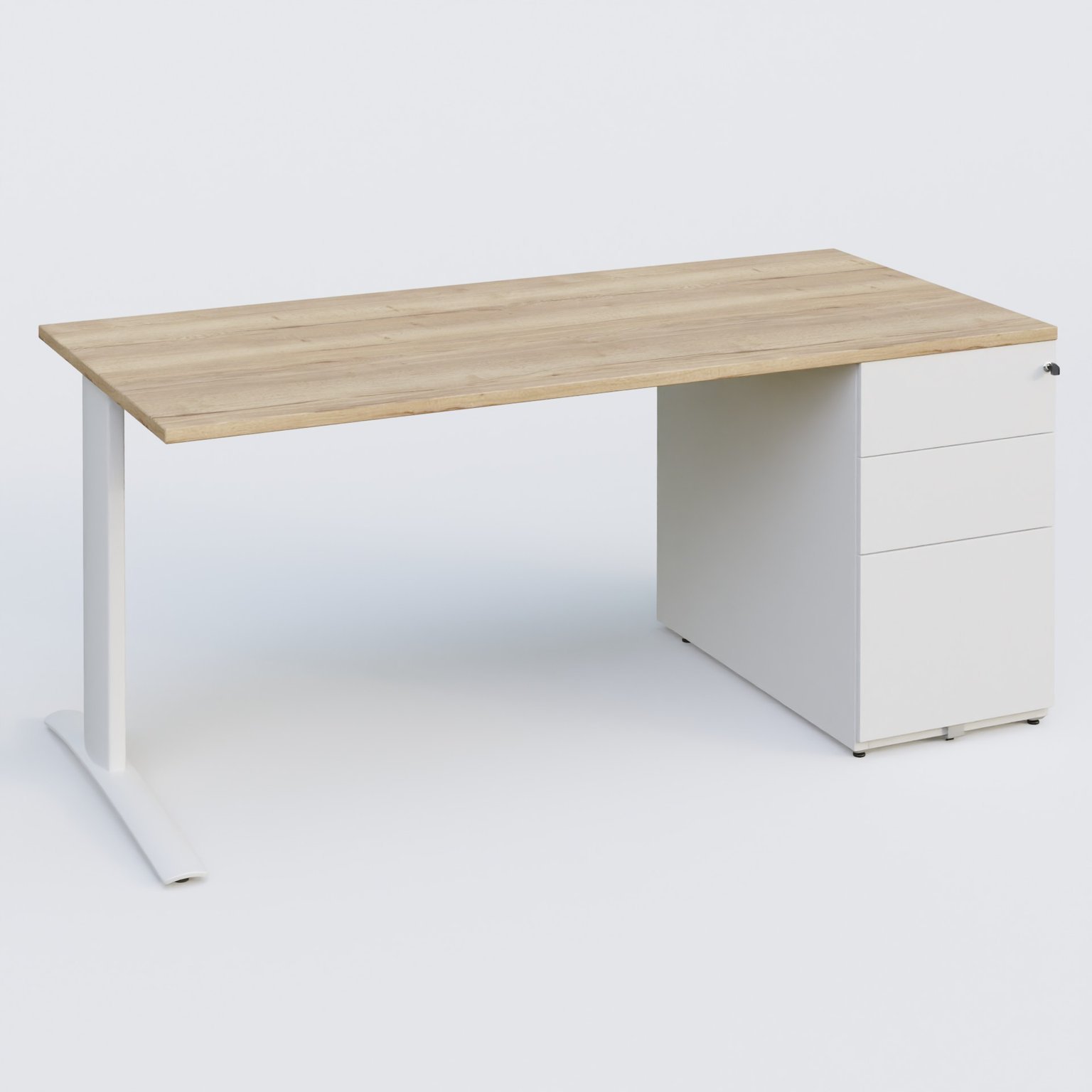 K1 Plateau droit 180x80 avec caisson métal porteur sous plateau à droite. Plateau Chêne naturel et pietement Blanc