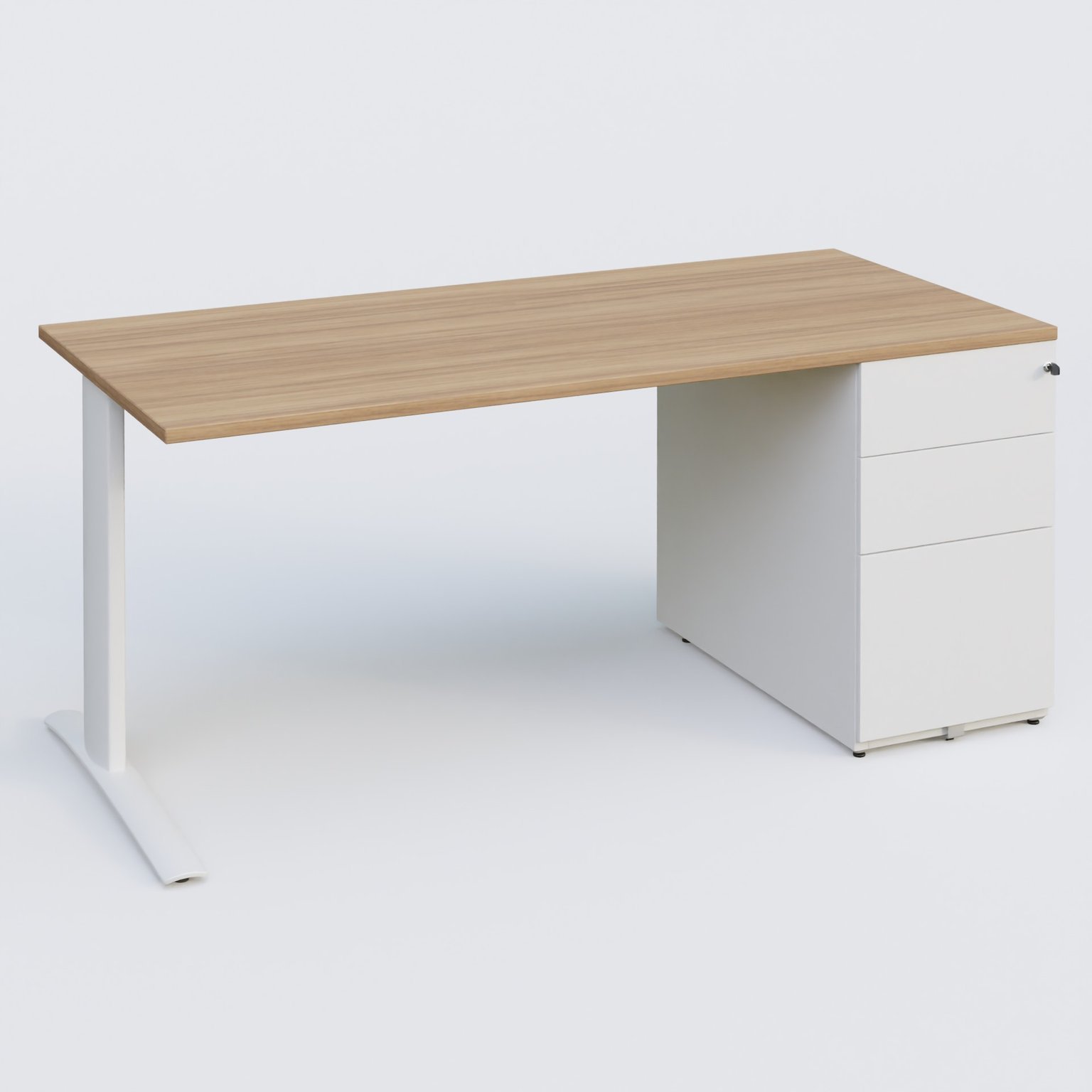 Plan droit mélamine en 25 mm avec caisson métal 3 tiroirs porteur sous plateau à droite qui remplace un pied.