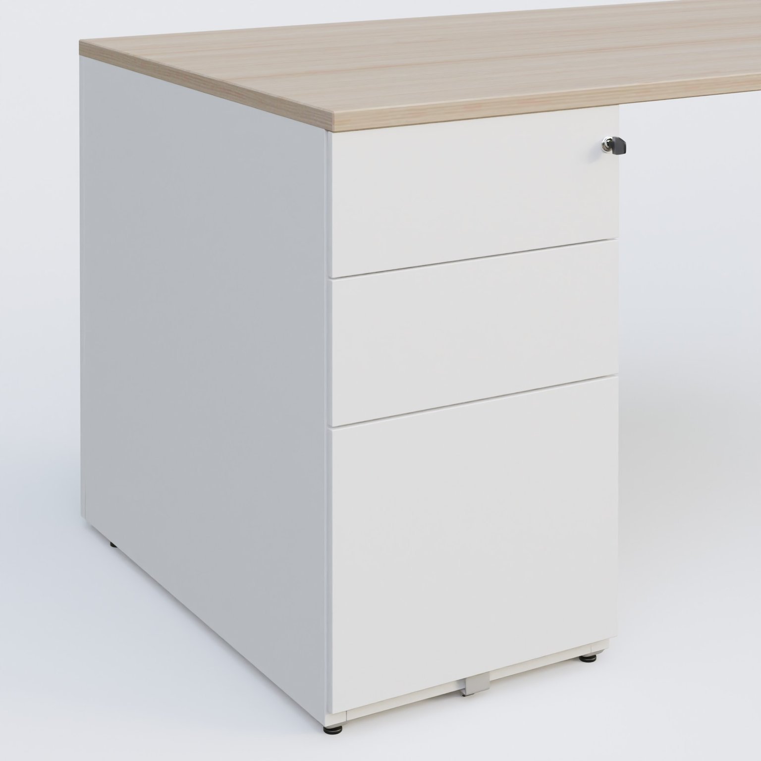 Plan droit mélamine en 25 mm avec caisson métal 3 tiroirs porteur sous plateau à gauche qui remplace un pied.