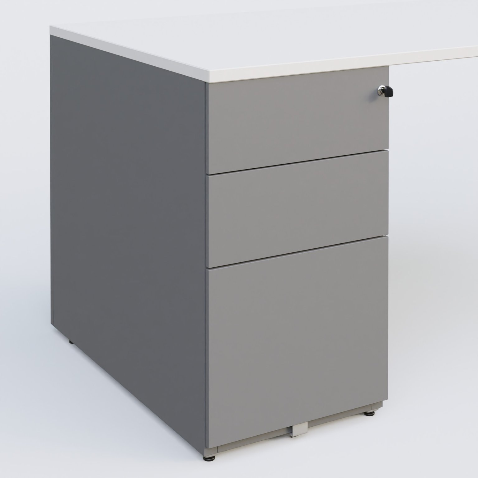 Plan droit mélamine en 25 mm avec caisson métal 3 tiroirs porteur sous plateau à gauche qui remplace un pied.